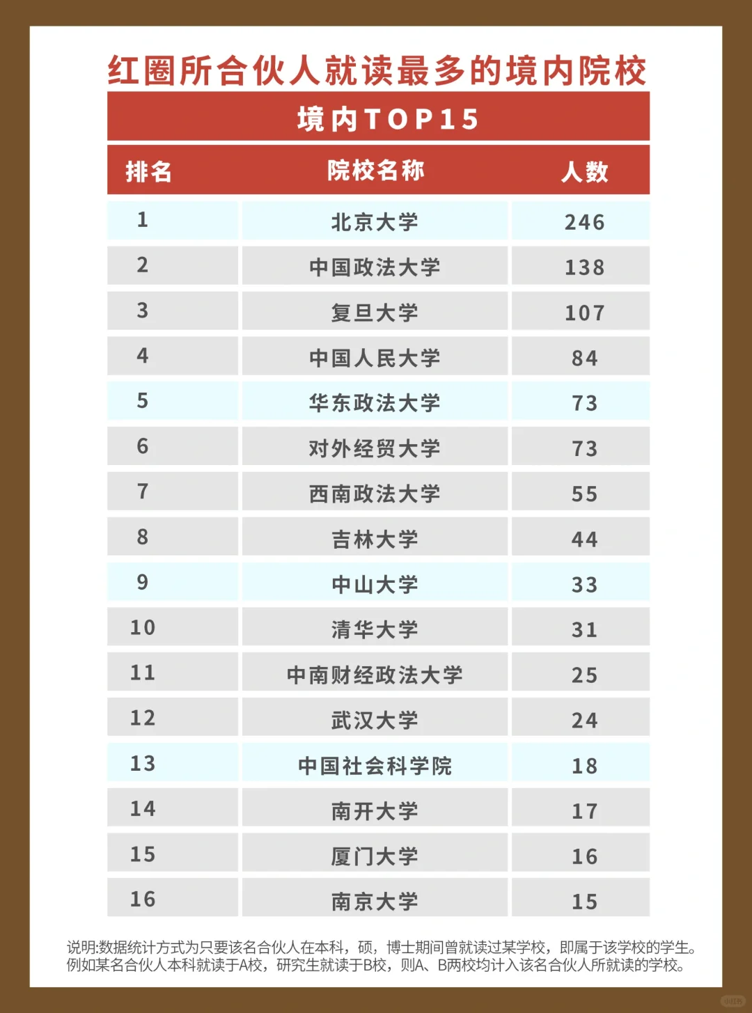 经对红圈所 1042 名合伙人毕业院校的梳理统计,可发现绝大多数学者皆毕业于中国顶尖的法学院校🤩。