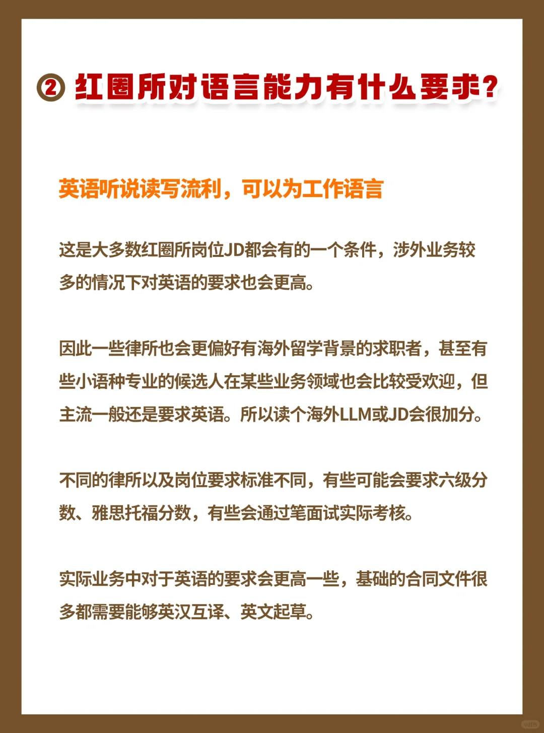 英语听、说、读、写皆流利,能作工作语言之用🤝。多数红圈所岗位 JD 皆对英语水平设有要求,涉外业务繁多之际,对英语之要求则更为严苛😜。