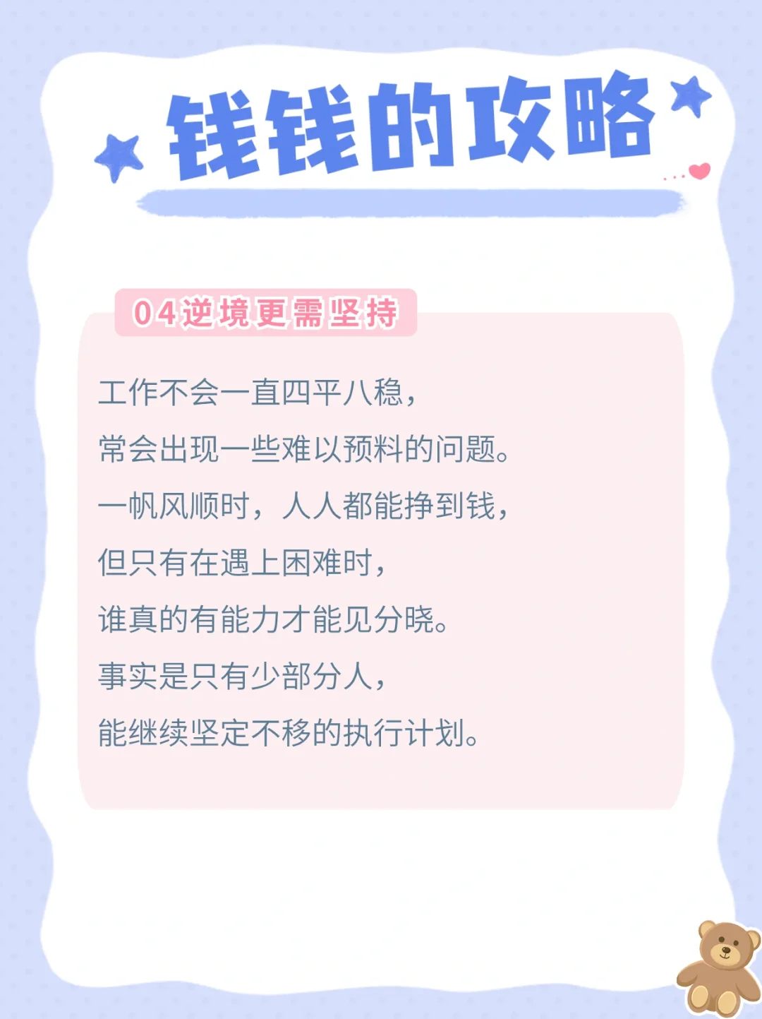 钱钱理念:「即使遇到了困难和问题,也得实施你的计划。如果事情一切顺利,谁都能完成任务,只有在出现真正的问题时,谁强谁弱才能见分晓。只有少部分人能继续坚定不移的贯彻执行他们的计划」