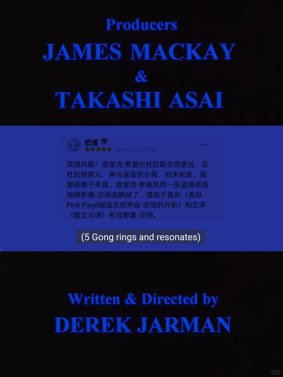 “但那是多么夺人心魄的77分钟的蓝呀,说不清是清晨还是黄昏,连加曼的画外音都可以被忽略,我们自动进入子宫般的静谧国度,一个因完美的持续而造成的神秘产生了巨大的美感,先锋电影装模作样的自大在这里石沉蓝海。自然《蓝》是电影史上的一个重要文本,我们也很容易向它馈赠各种前卫的标签,但是,关于电影的主题,加曼却说得老实又古典:这是我的死和英国的死。”——毛尖