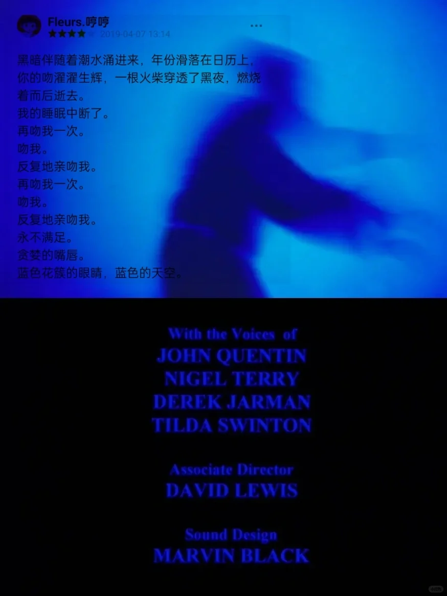 德里克·贾曼最后的影像「蓝」 ,记录下了他罹患艾滋后的最后岁月。此时的贾曼已经双目失明,面对他的是死亡的颜色——这忧郁的蓝🩵