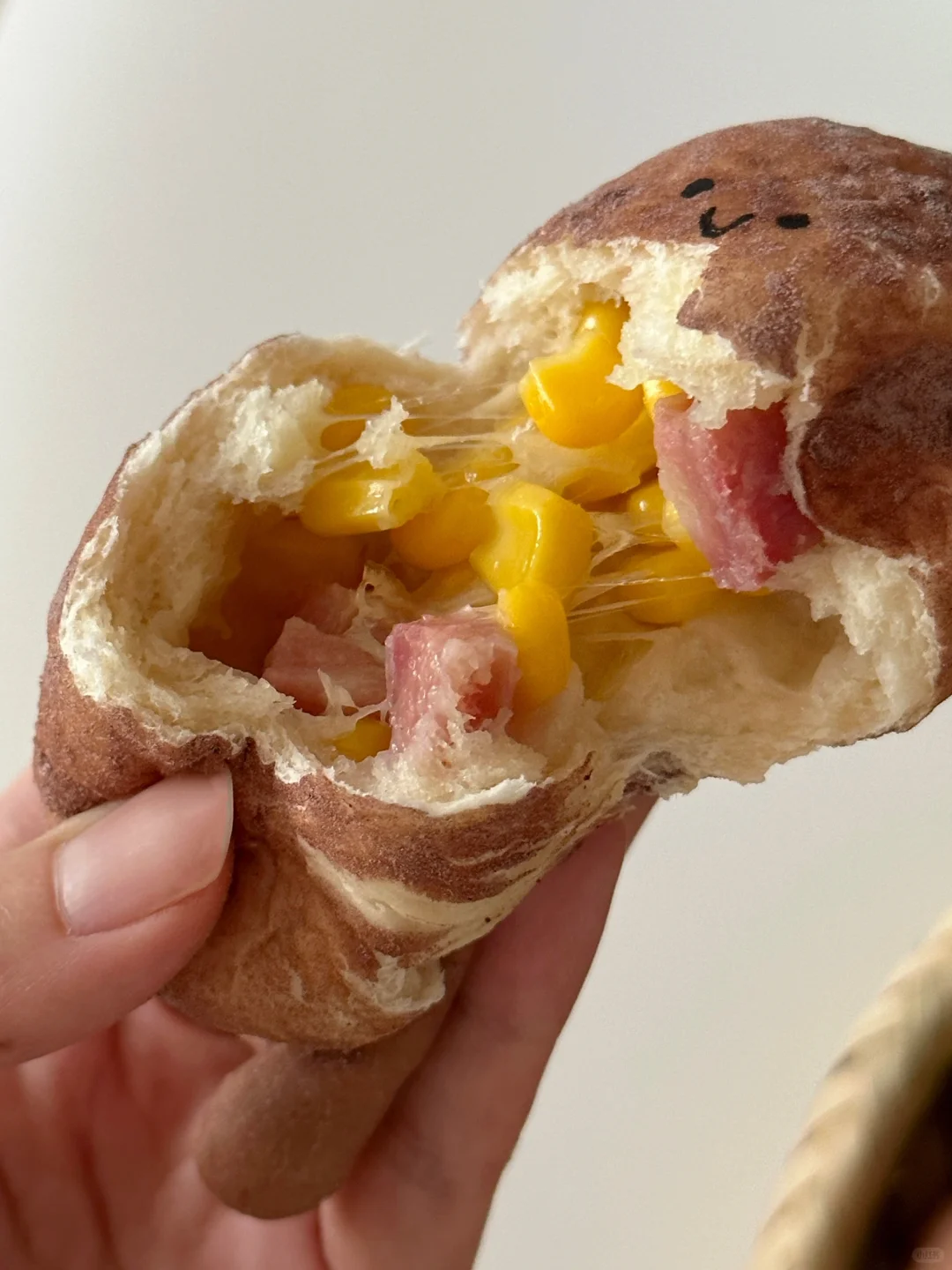 是好吃的芝士玉米火腿馅儿~[派对R]热乎乎软绵绵的面包体掰开还有能拉丝的芝士~咸香美味~