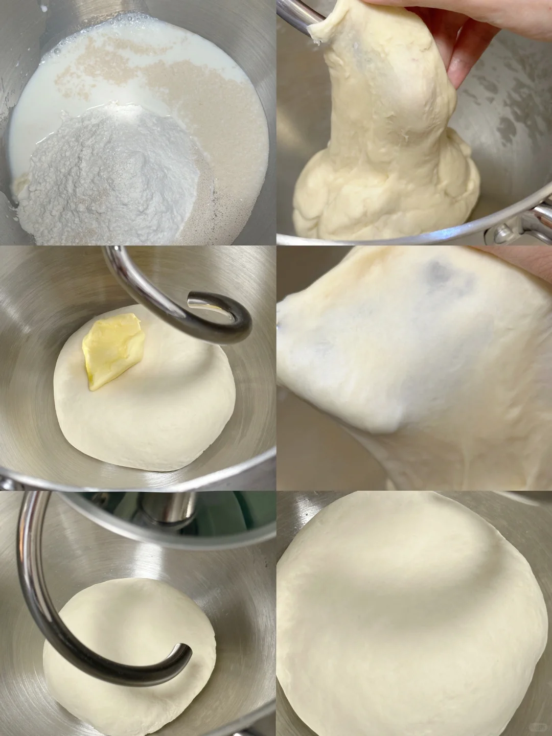 高筋面粉250g,白砂糖20g,酵母3g,牛奶180g,盐2g,黄油20g