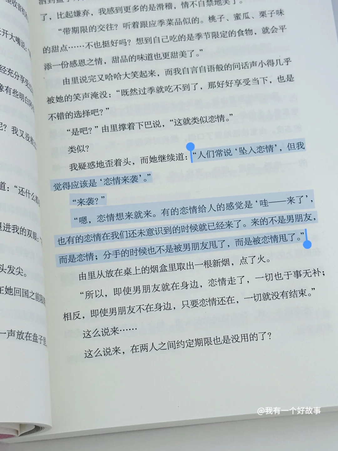 作者是日本治愈系作家青山智美子,读过不止一本她的书了,但是感觉这本写的尤其深入我心,超爱书中的金句,既窥探到了恋爱情侣的内心,又细腻真实,完全就是那种,读过一遍还想再摘抄下来反复读的程度!