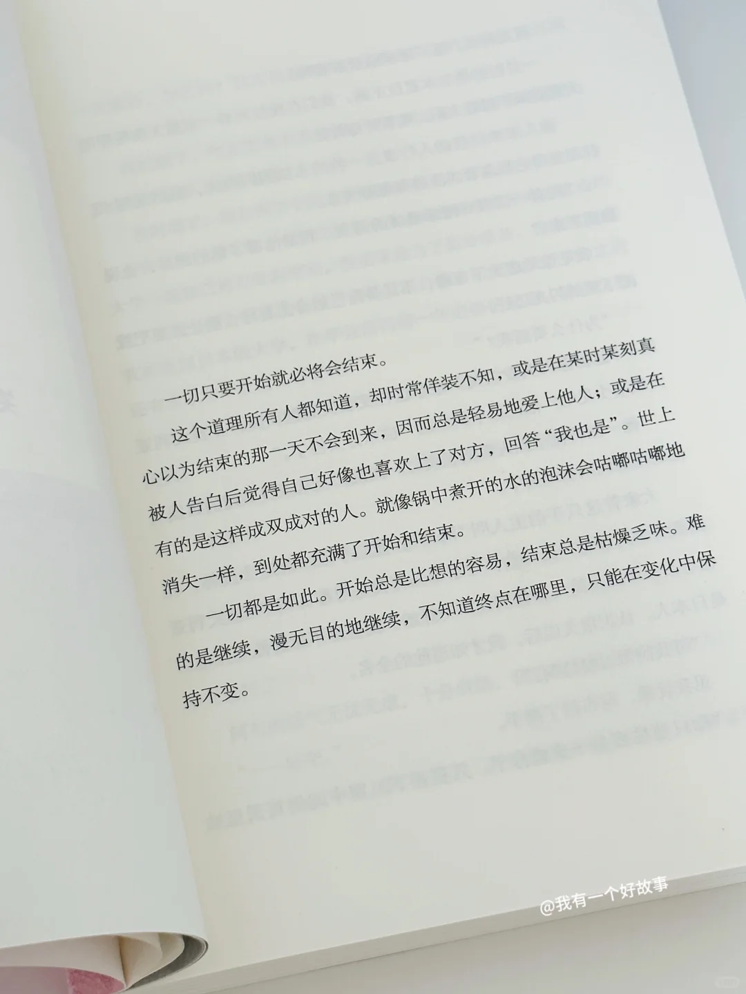 我害怕的不是结束,而是结束前的那段心神不宁的时日,人一旦开始产生猜忌,不知道的事就会越来越多,有些事本以为会得到对方的理解,希望却会彻底落空。到那时候,一方往往会献上自己全部的炙热,另一方则会变得冷淡而败兴。