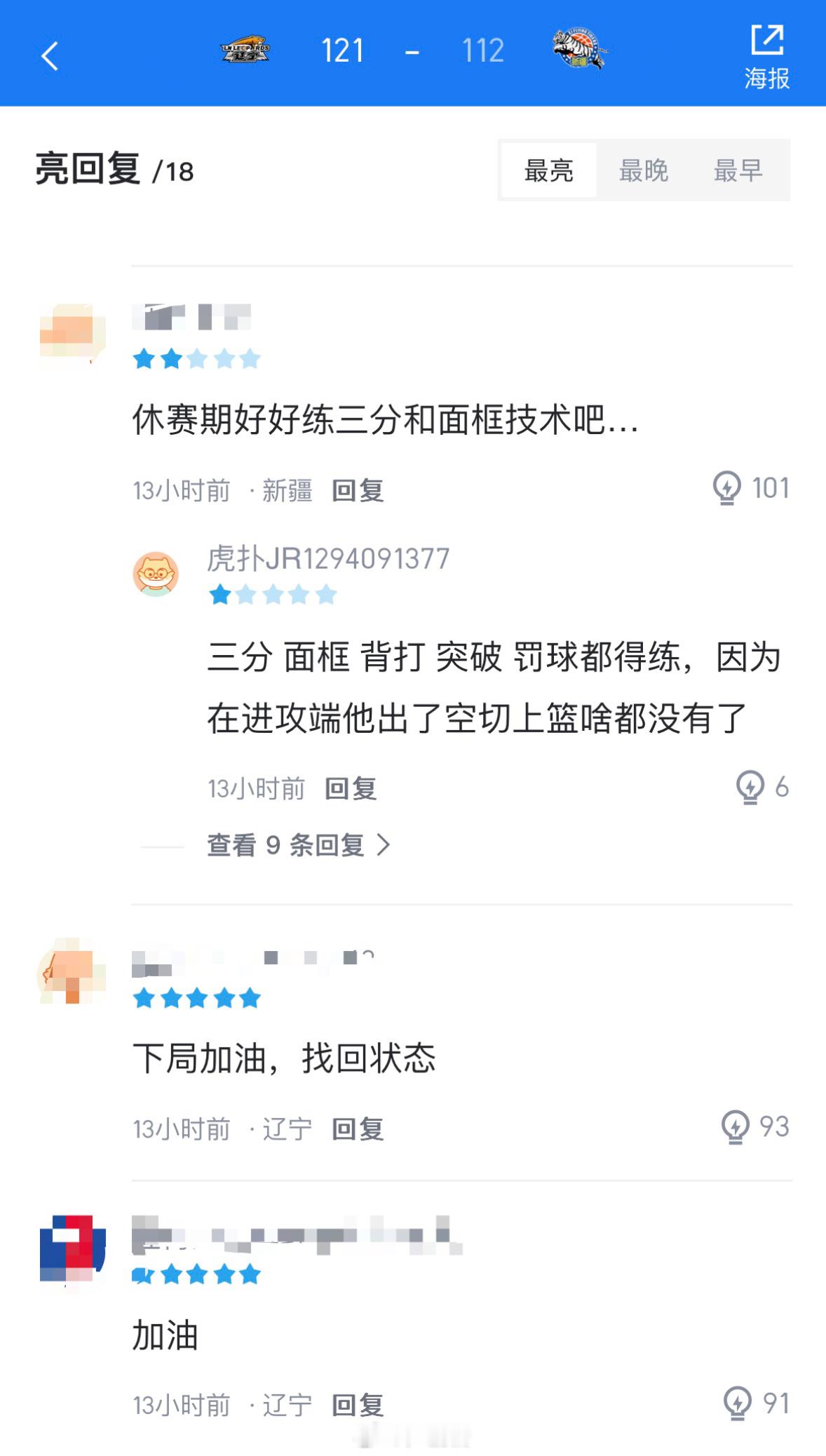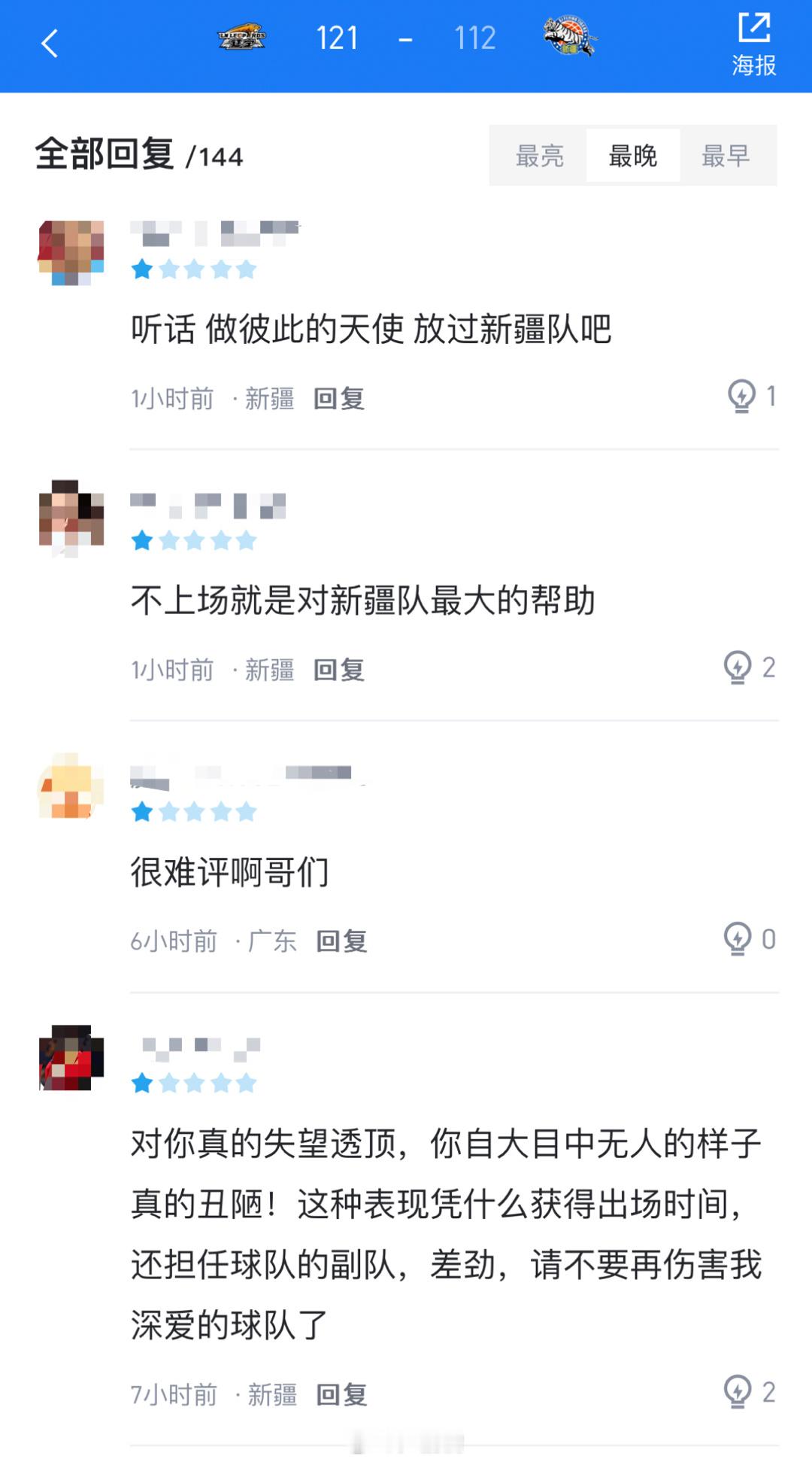 阳光普照 4 2024-05-16 16:39 新疆球迷和浙江球迷就是比广东球迷素质高,人家输球不输人,不像广东输球就怨天怨地怨裁判怨父母,好像全世界都亏欠他一样。偷笑门三主角,两个在广东,一个做主教练,一个做总经理,就这样没有爱国心的人带出的队伍能好到哪里,能够喜欢这样球队的球迷也可想而知,曾经当神一样崇拜的太空易,退役就移民丑国,所以说正义球迷没有喜欢广东队的。