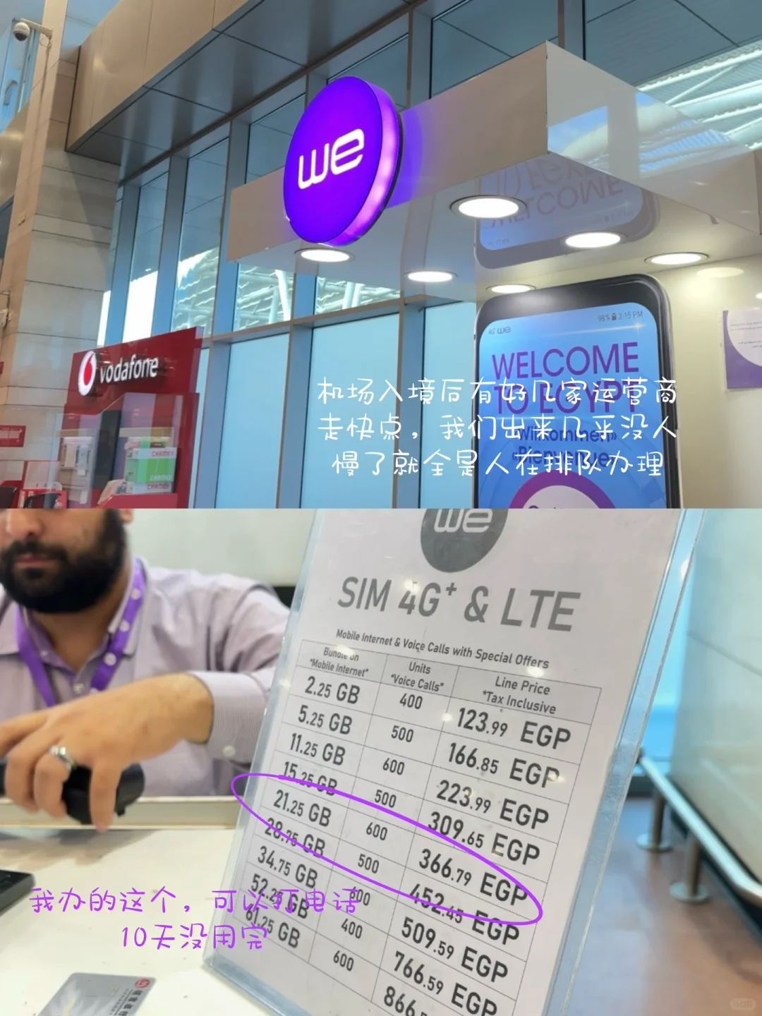 开罗机场出境后有各大运营商柜台,办的WE信号挺好的,除了在沙漠没信号,366.79埃镑 21.25GB 10天,走之前还没用完
