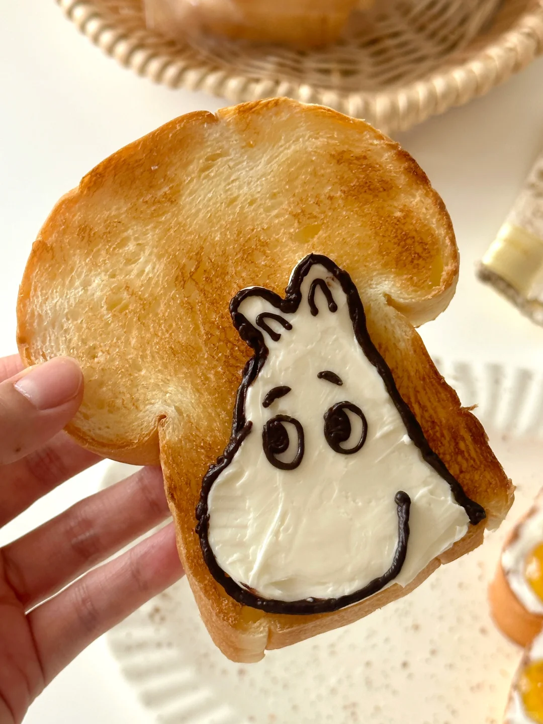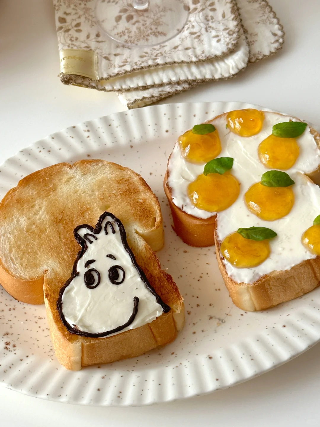 酸酸甜甜的杏子酱搭配奶油奶酪!涂抹在吐司上,无论是下午茶还是早餐都很nice~[萌萌哒R][萌萌哒R] 在烤面包片上画出可可爱爱的姆明小精灵后,就一点儿都舍不得下口了[哭惹R]