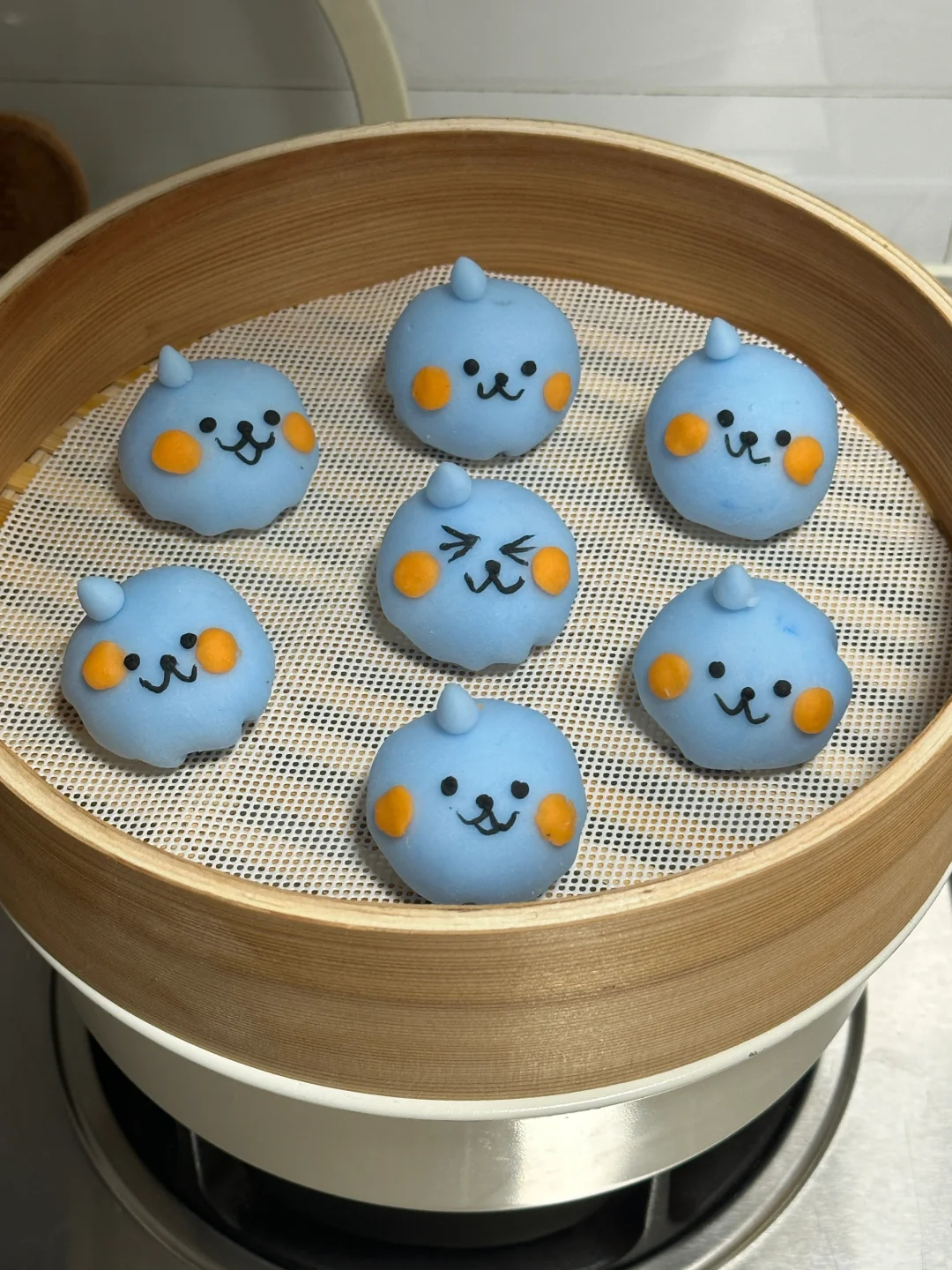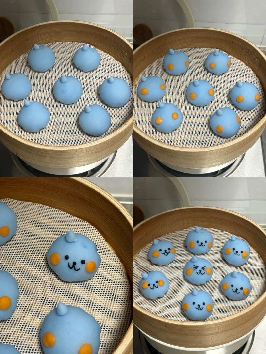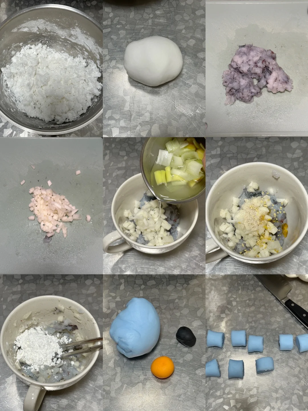 ⑤蓝色大面团切成小剂子,饺子皮大小,包包子手法包好