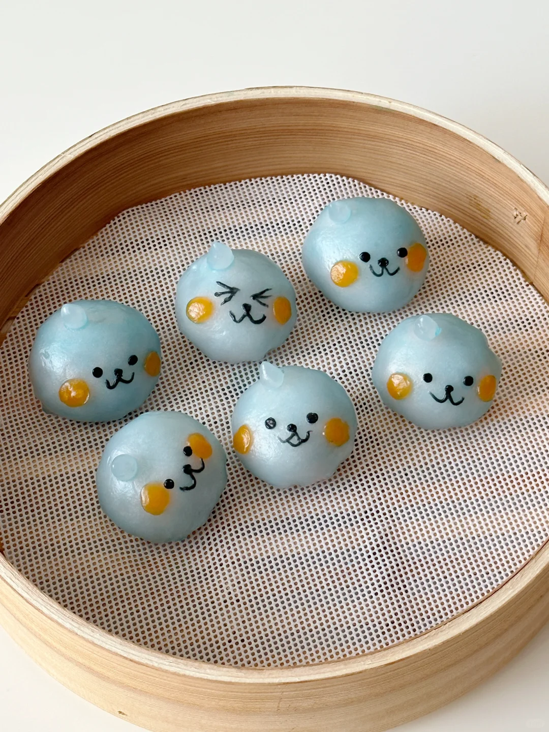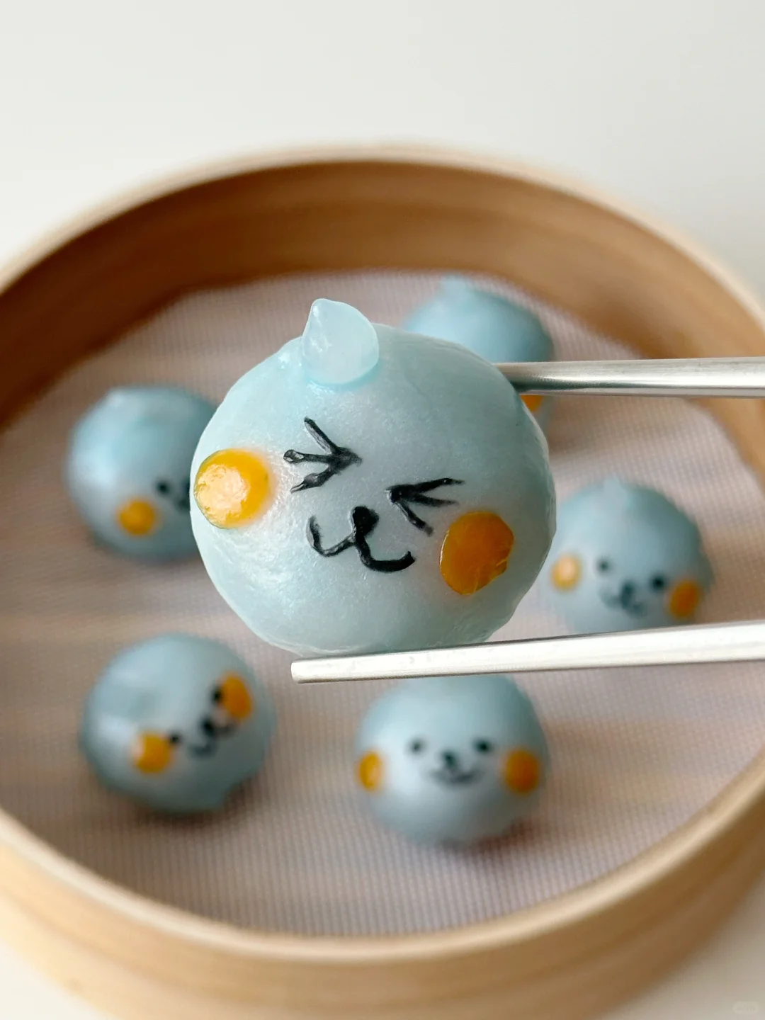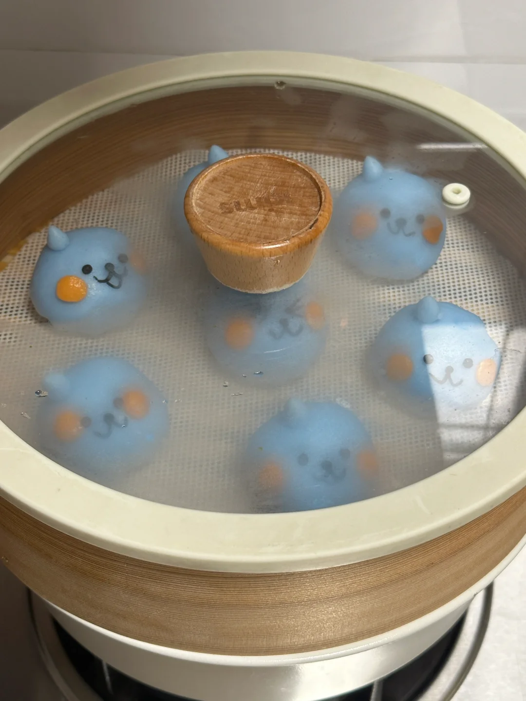 ⑤蓝色大面团切成小剂子,饺子皮大小,包包子手法包好