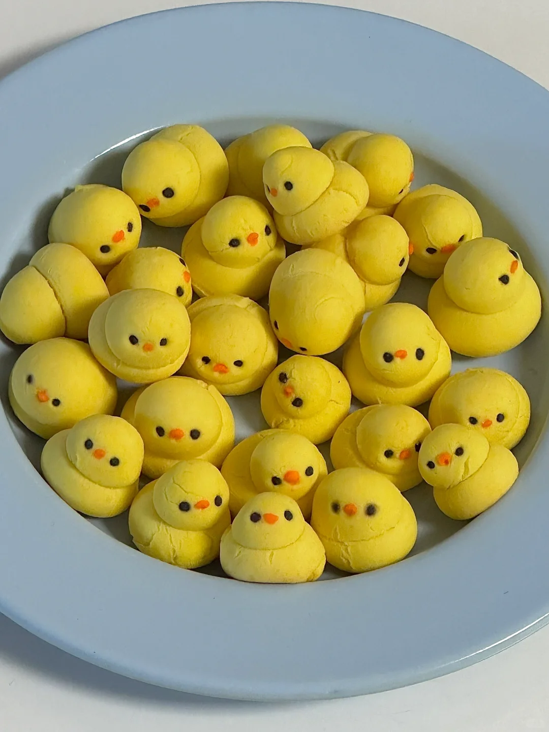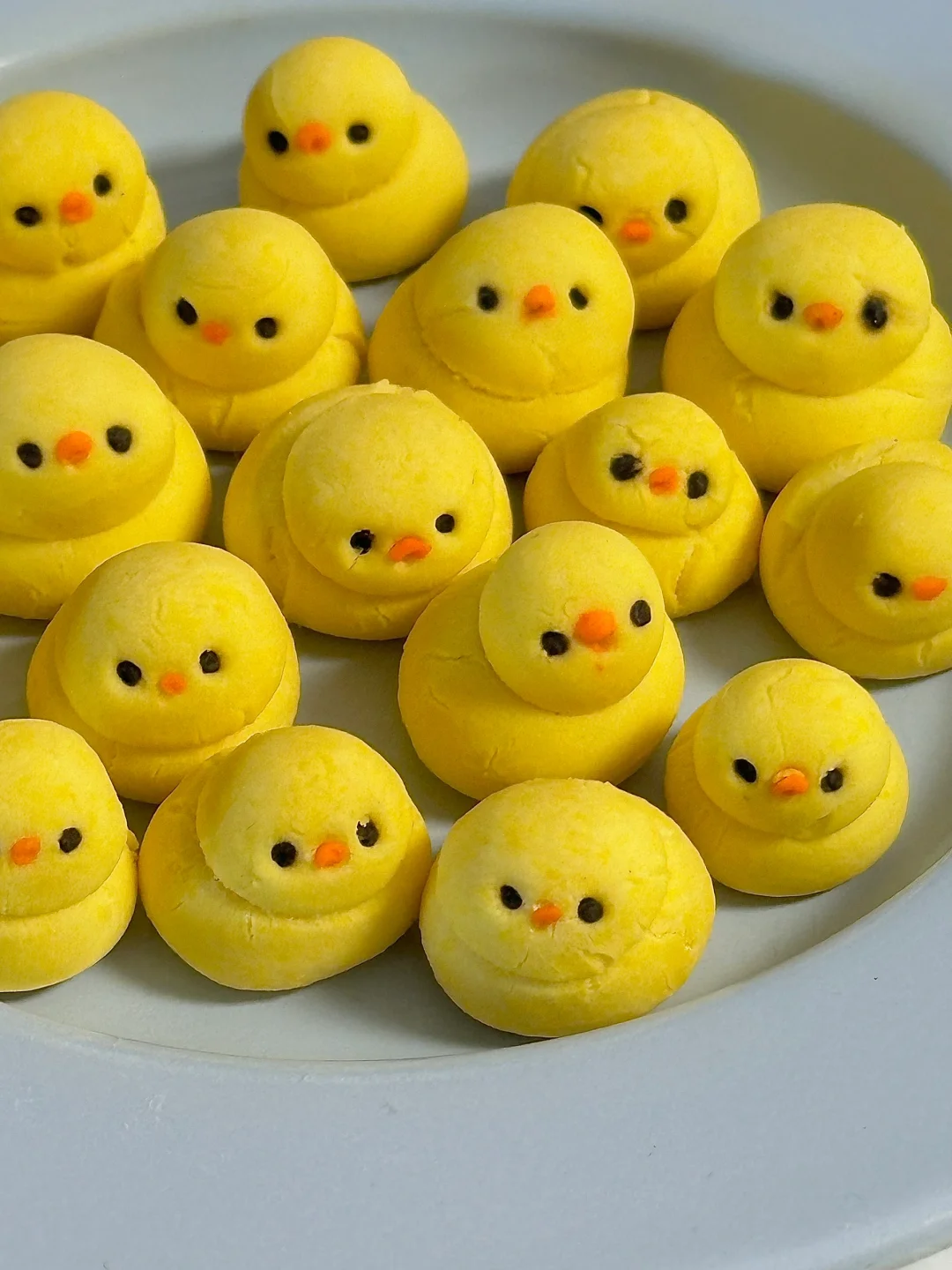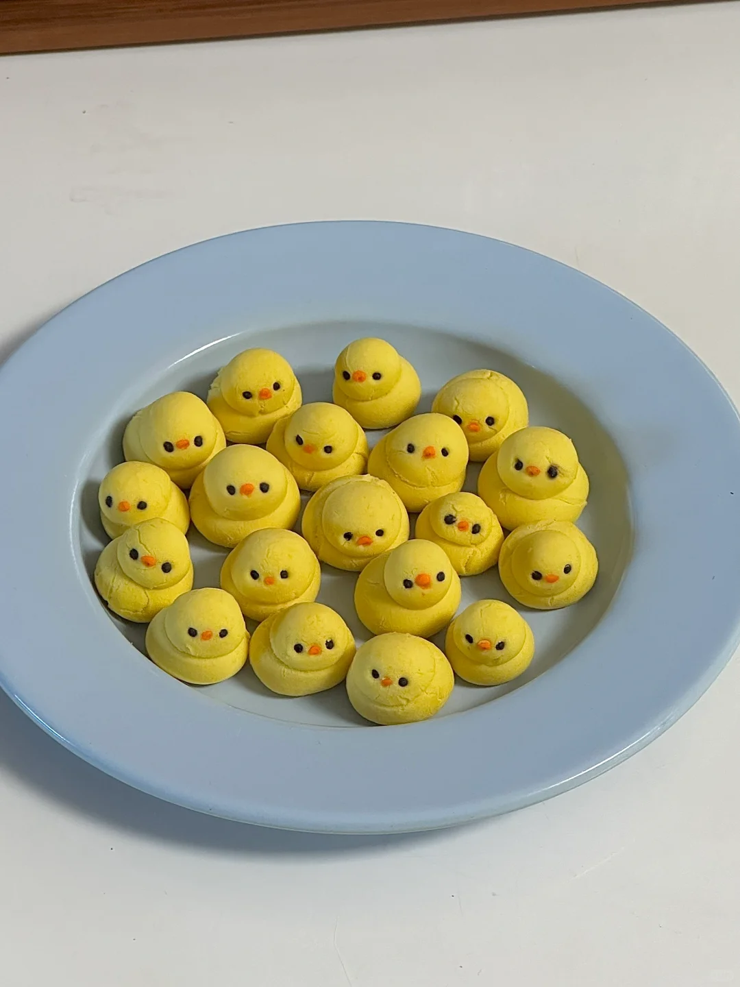哈哈哈是小鸡形象的入口即化的小馒头 配料: 小馒头:80g淀粉、20g低筋面粉、12g黄油、10g椰子油、10g糖粉、30g牛奶、1g泡打粉、1个蛋黄 调色:色素(可以用蔬果粉代替) 1.黄油和椰子油微波炉叮30秒融化,加入蛋黄和黄色色素拌匀,然后加入所有粉类(面粉、淀粉、糖粉、泡打粉),混成细沙状,再加入牛奶揉成团 2.面团分份调色,做成小鸡形象 3.烤箱预热150度烤18分钟左右(仅供参考,可以偷吃一位看看熟没有)