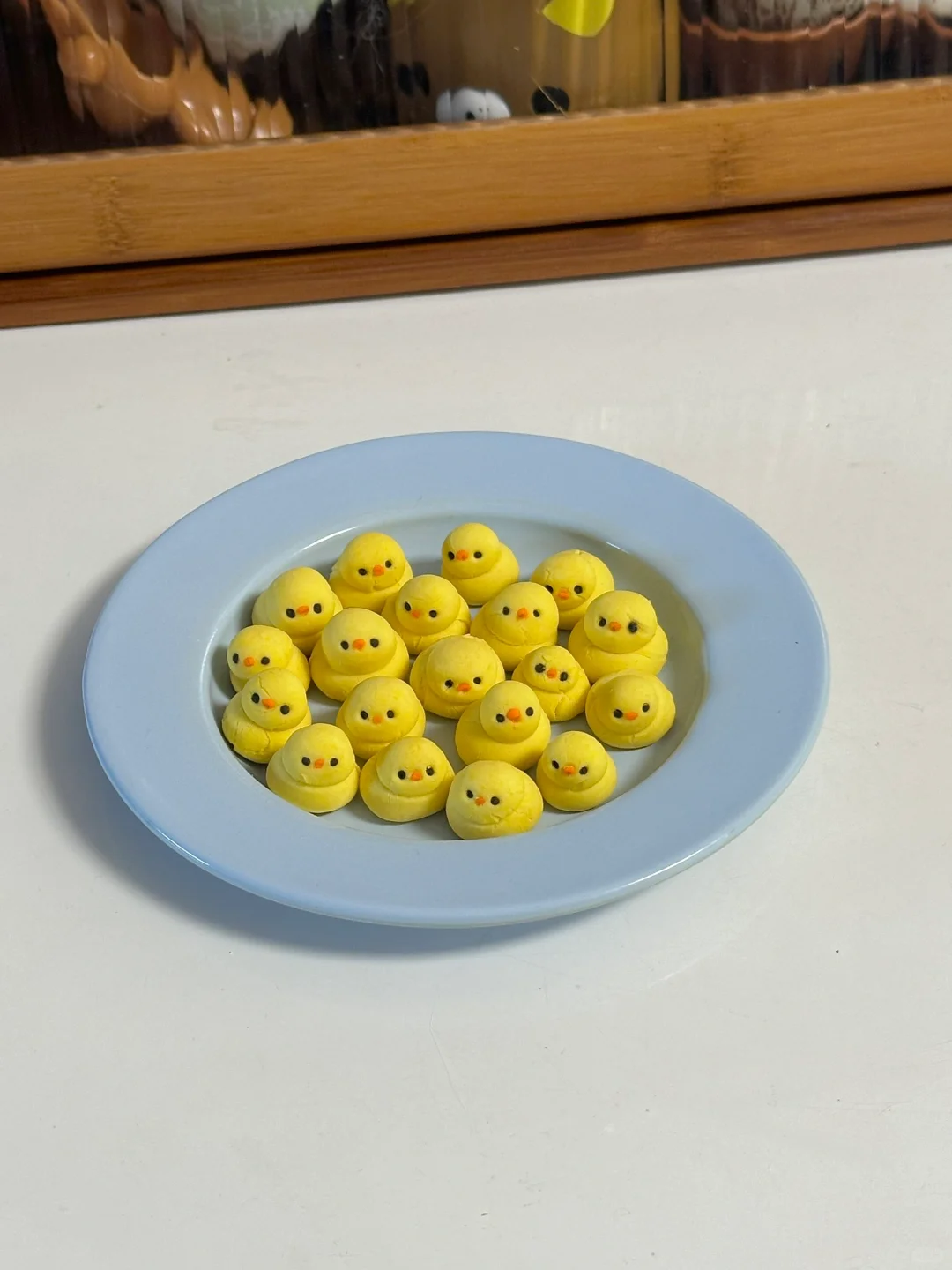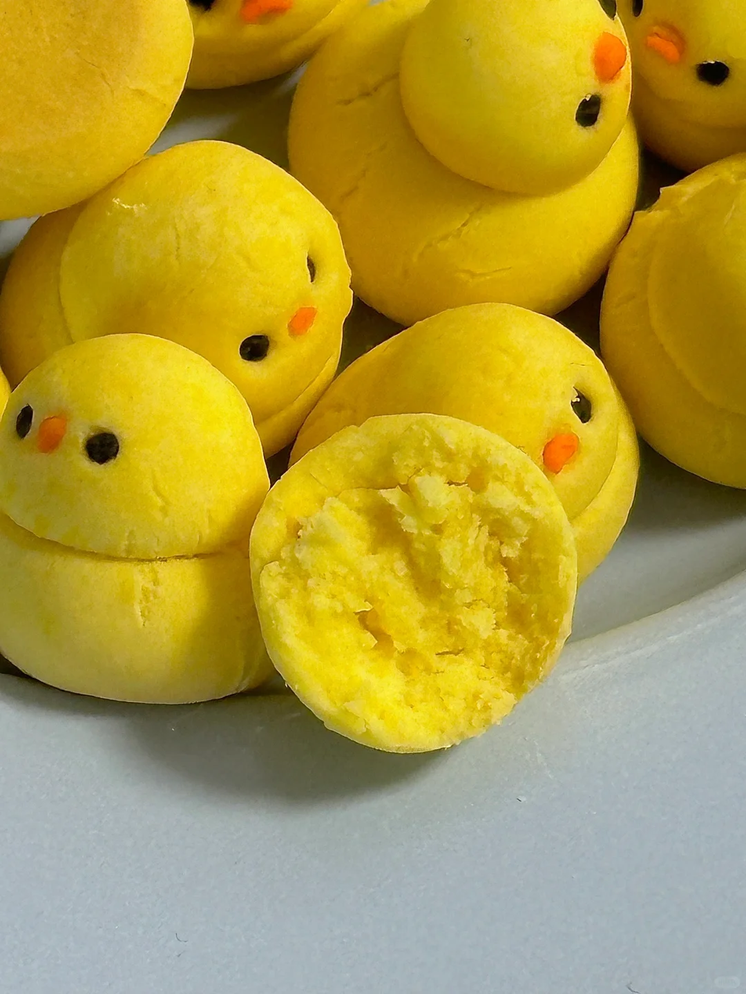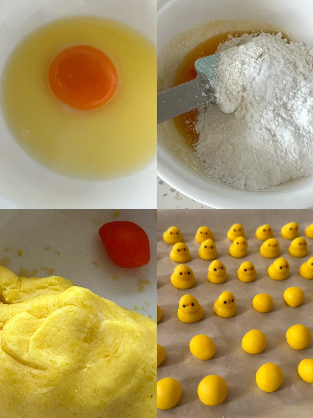 哈哈哈是小鸡形象的入口即化的小馒头 配料: 小馒头:80g淀粉、20g低筋面粉、12g黄油、10g椰子油、10g糖粉、30g牛奶、1g泡打粉、1个蛋黄 调色:色素(可以用蔬果粉代替) 1.黄油和椰子油微波炉叮30秒融化,加入蛋黄和黄色色素拌匀,然后加入所有粉类(面粉、淀粉、糖粉、泡打粉),混成细沙状,再加入牛奶揉成团 2.面团分份调色,做成小鸡形象 3.烤箱预热150度烤18分钟左右(仅供参考,可以偷吃一位看看熟没有)
