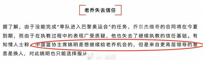据《新民晚报》报道,中国篮协主席姚明原本想继续给乔尔杰维奇机会,但来自更高层面的意思是换人,姚明也只能选择服从。