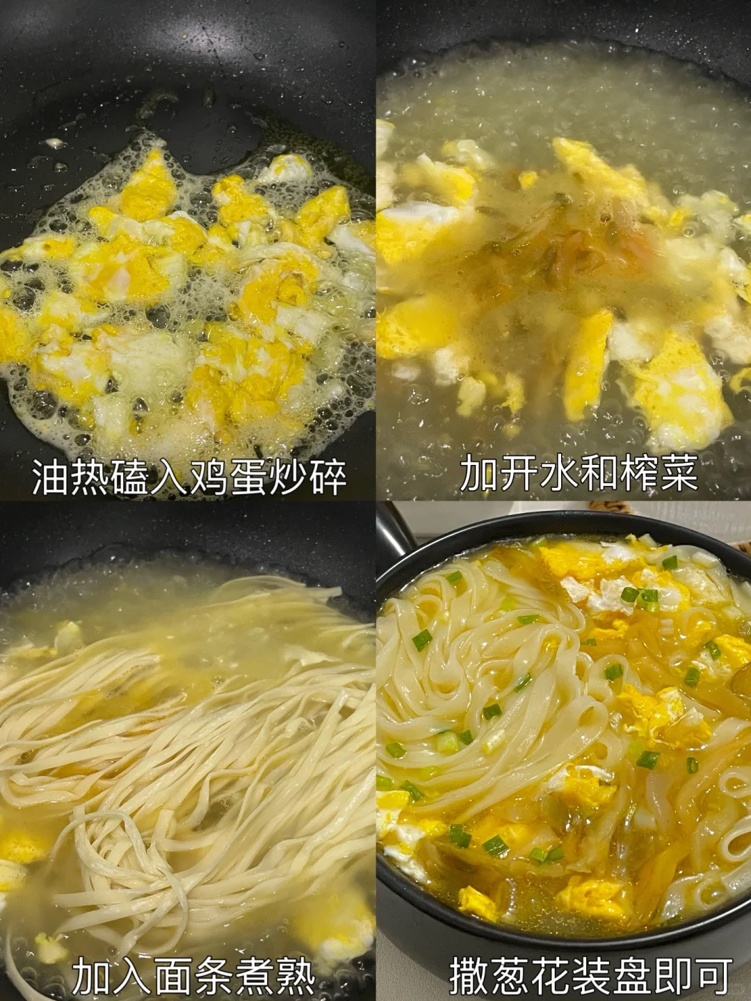1️⃣油热磕入鸡蛋炒碎,加适量开水和榨菜。适量盐、鸡精。