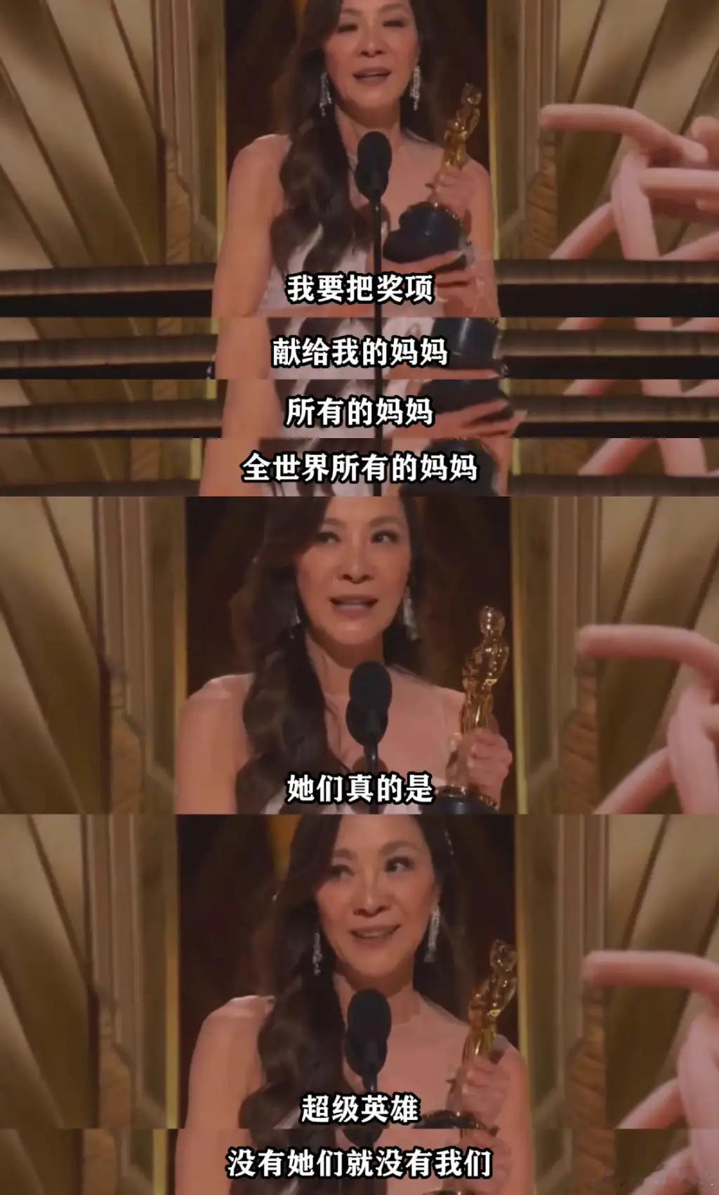 她还说:“我要把这个奖献给我的妈妈,以及全世界的妈妈,她们都是超级英雄。没有妈妈们,我们都无法站在这里。我的妈妈84岁了,我要把这个带给她。她正和家里人在马来西亚看电视。也要感谢香港的家人们,那是我事业起步的地方。感谢你们助我一臂之力,我才能站在这里。”