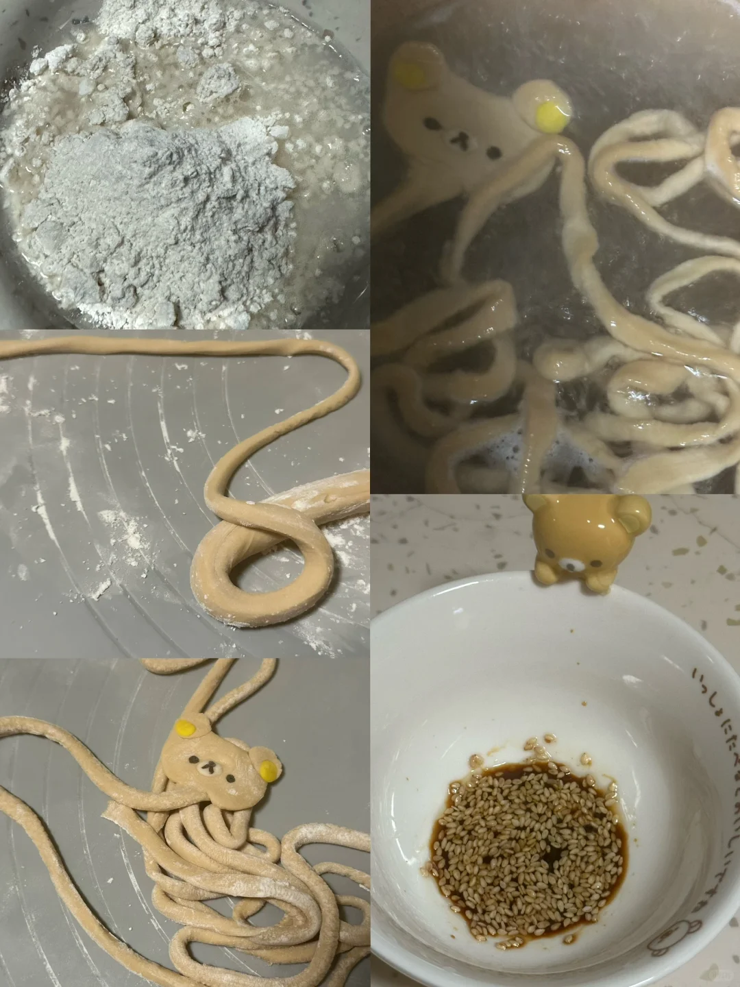 2.面条配料混合,分份调色揉匀,包上保鲜膜松弛30分钟,棕色慢慢拉长至喜欢的粗细,头部按扁做成轻松熊形状,水开下锅煮至浮起