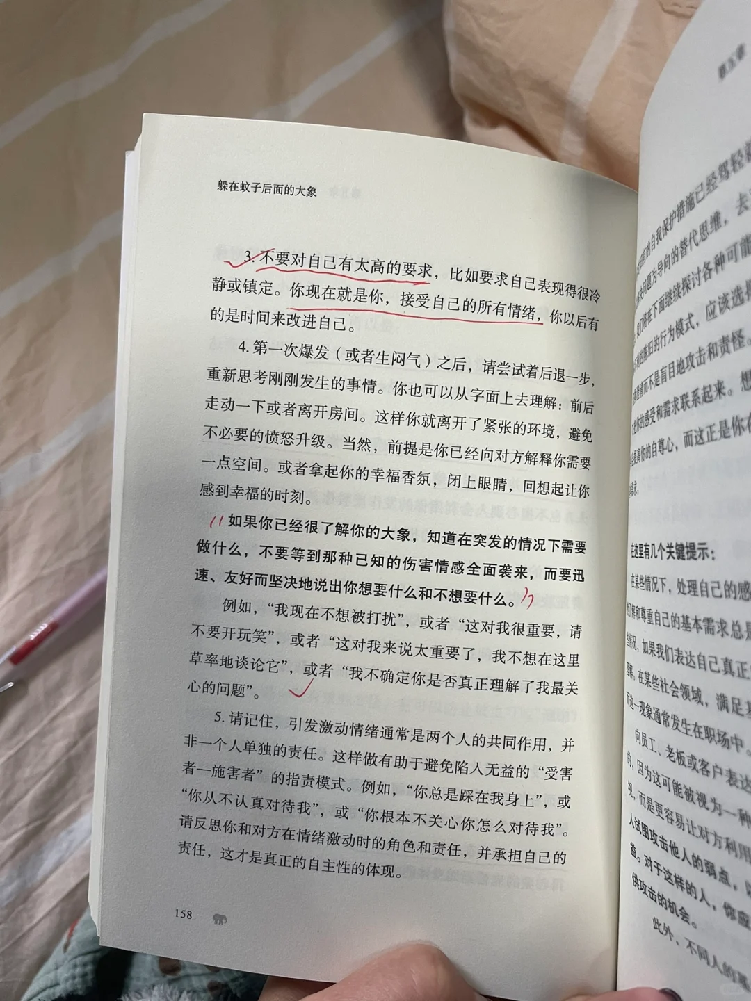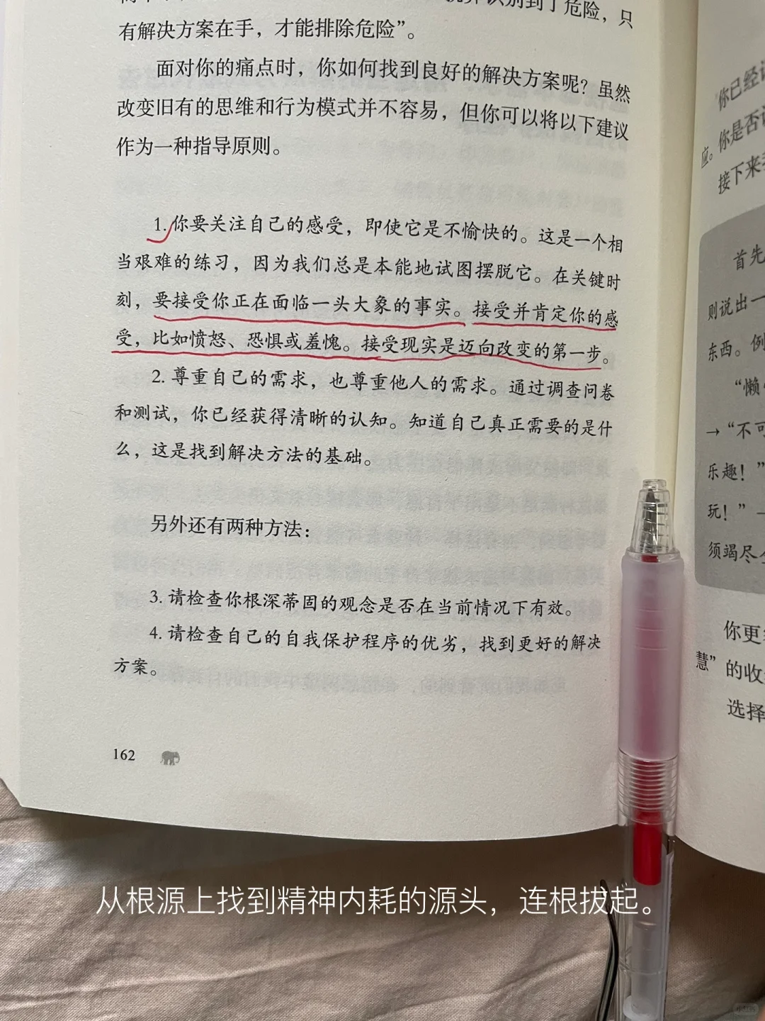 想起之前老是因为一些小事发飙、情绪失控,原来都是有迹可循的。透过蚊子揪出背后的那头隐藏的大象,正视并勇敢接纳自己的情绪,比如愤怒、恐惧、或羞愧,从根源上找到精神内耗的源头,连根拔起。