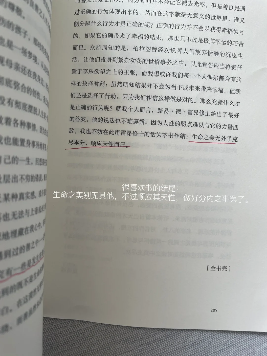 很喜欢书的结尾:“生命的美别无其他,不过顺应其天性,做好分内之事罢了。”