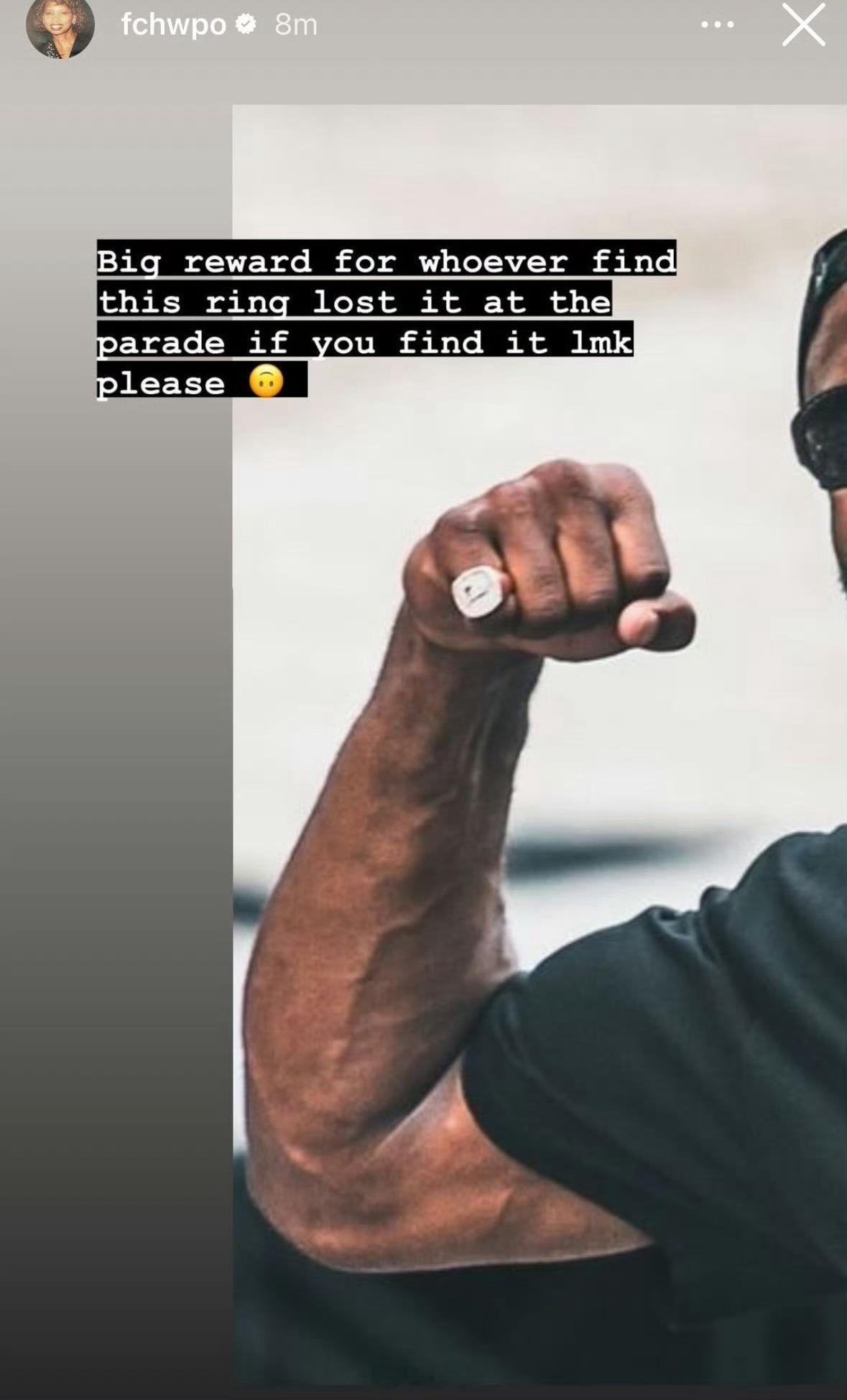 杰伦-布朗的7uice定制版戒指在游行中丢失,并且重金悬赏:“如果谁能找到我这枚在游行中丢失的戒指,将会有丰厚的报酬 🙃”
