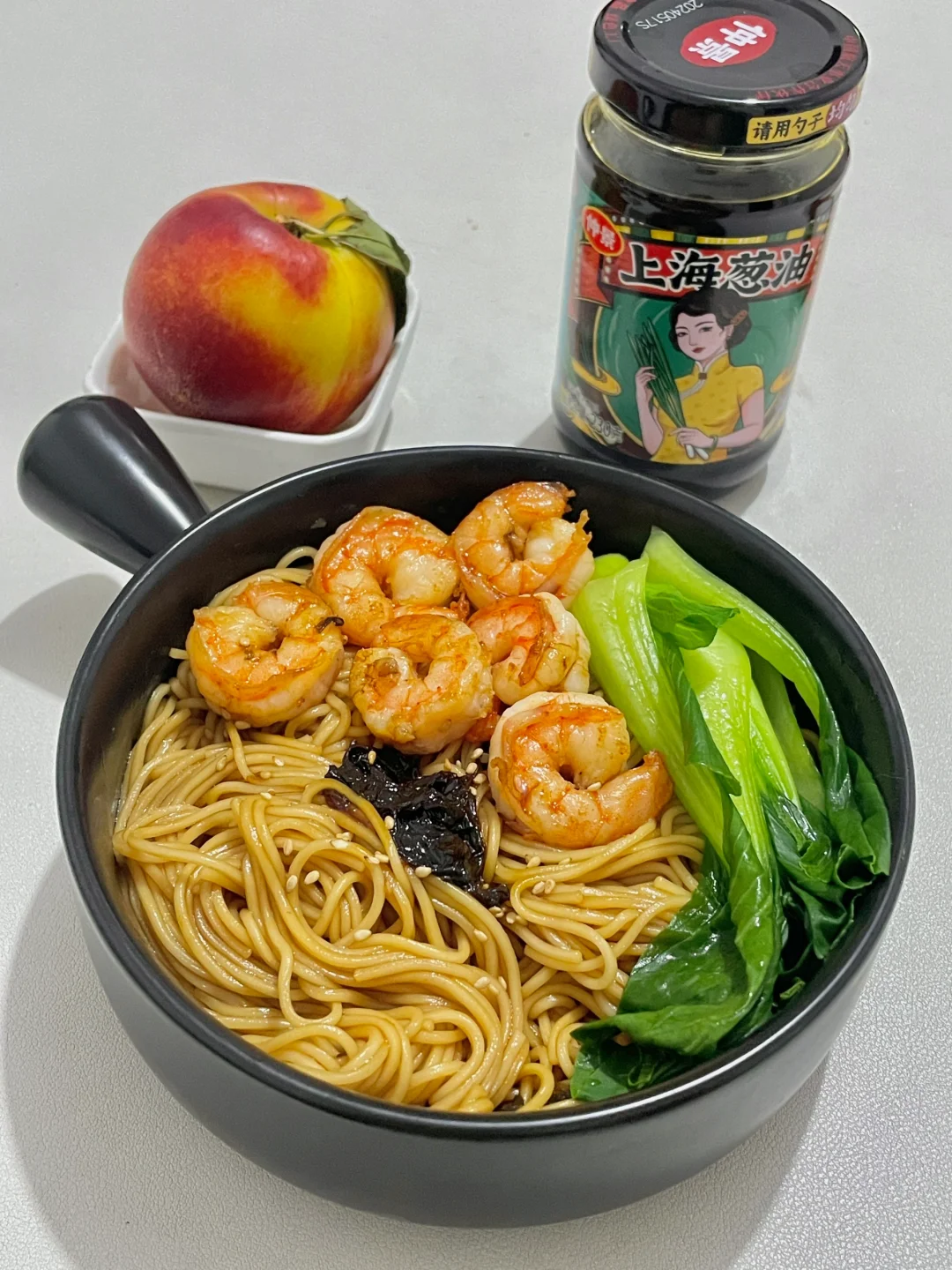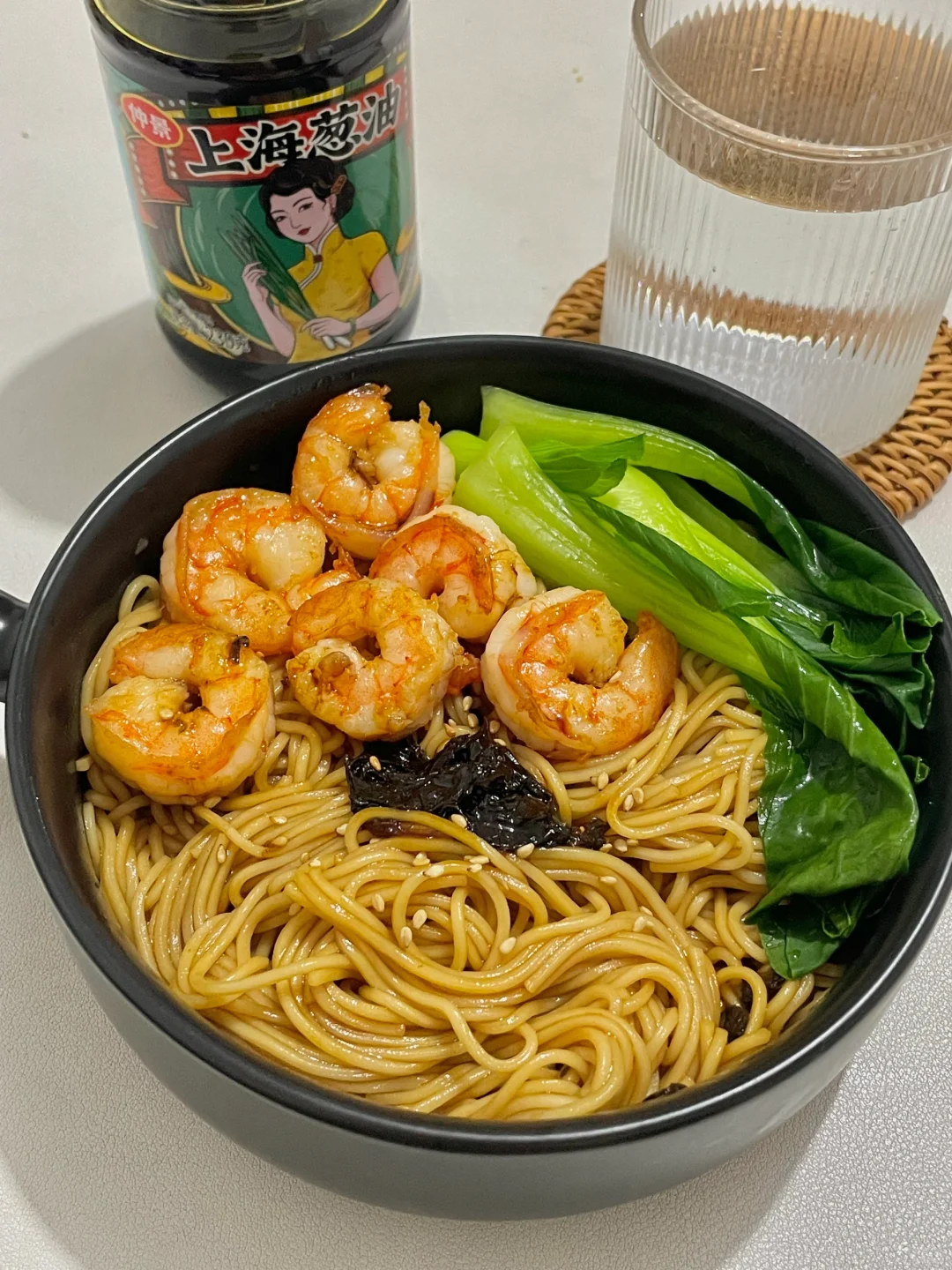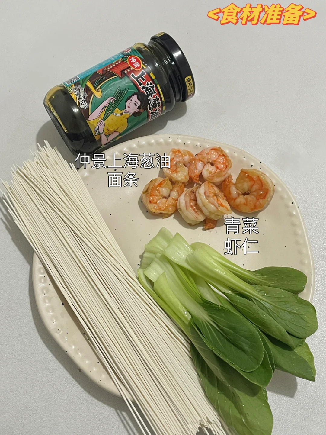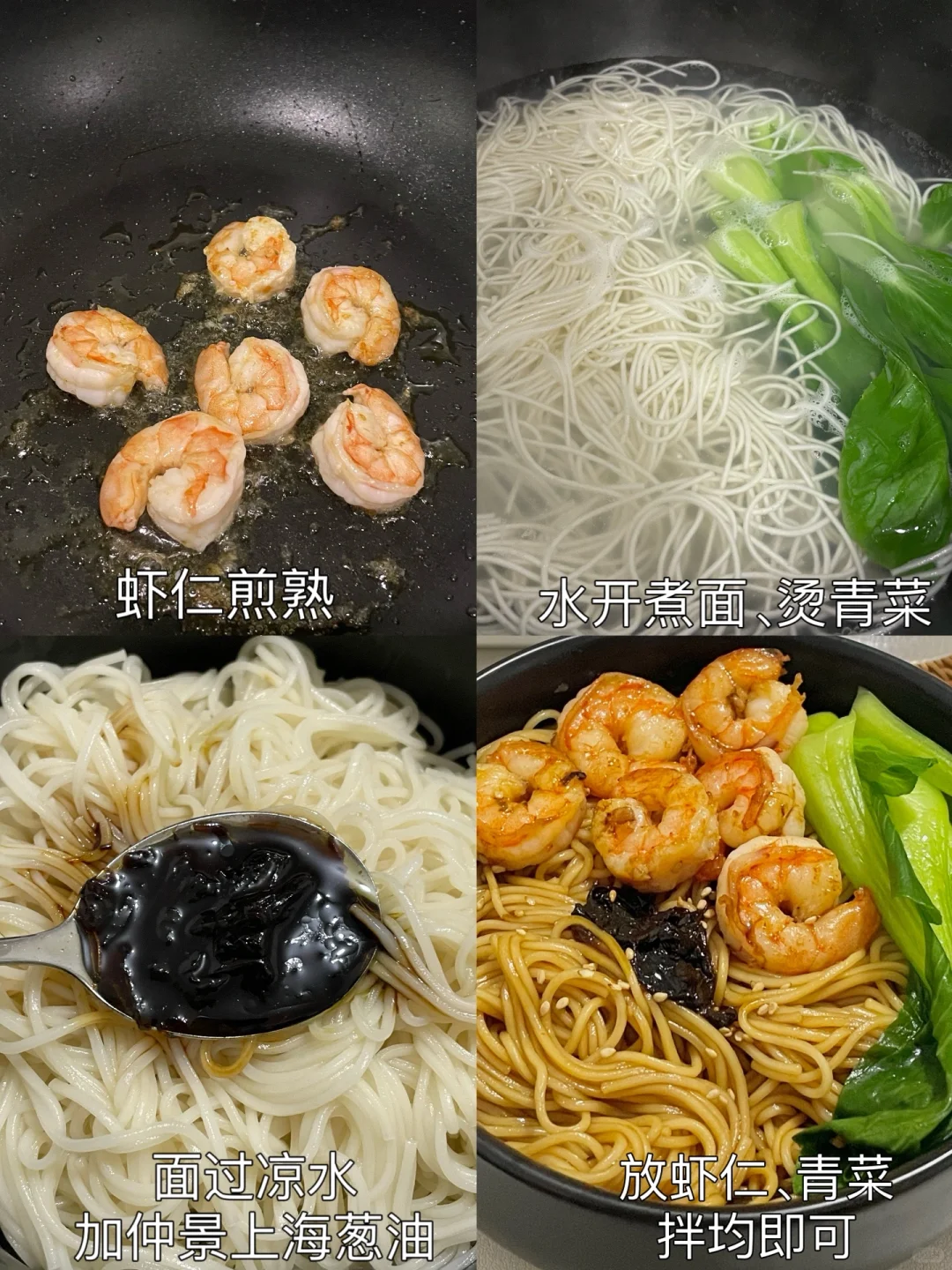 2️⃣面煮熟过凉水捞入碗中,加葱油。放虾仁青菜拌匀即可。