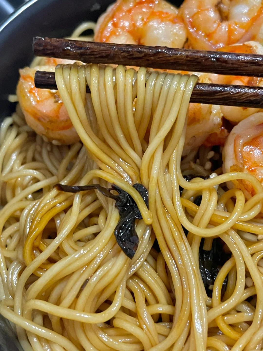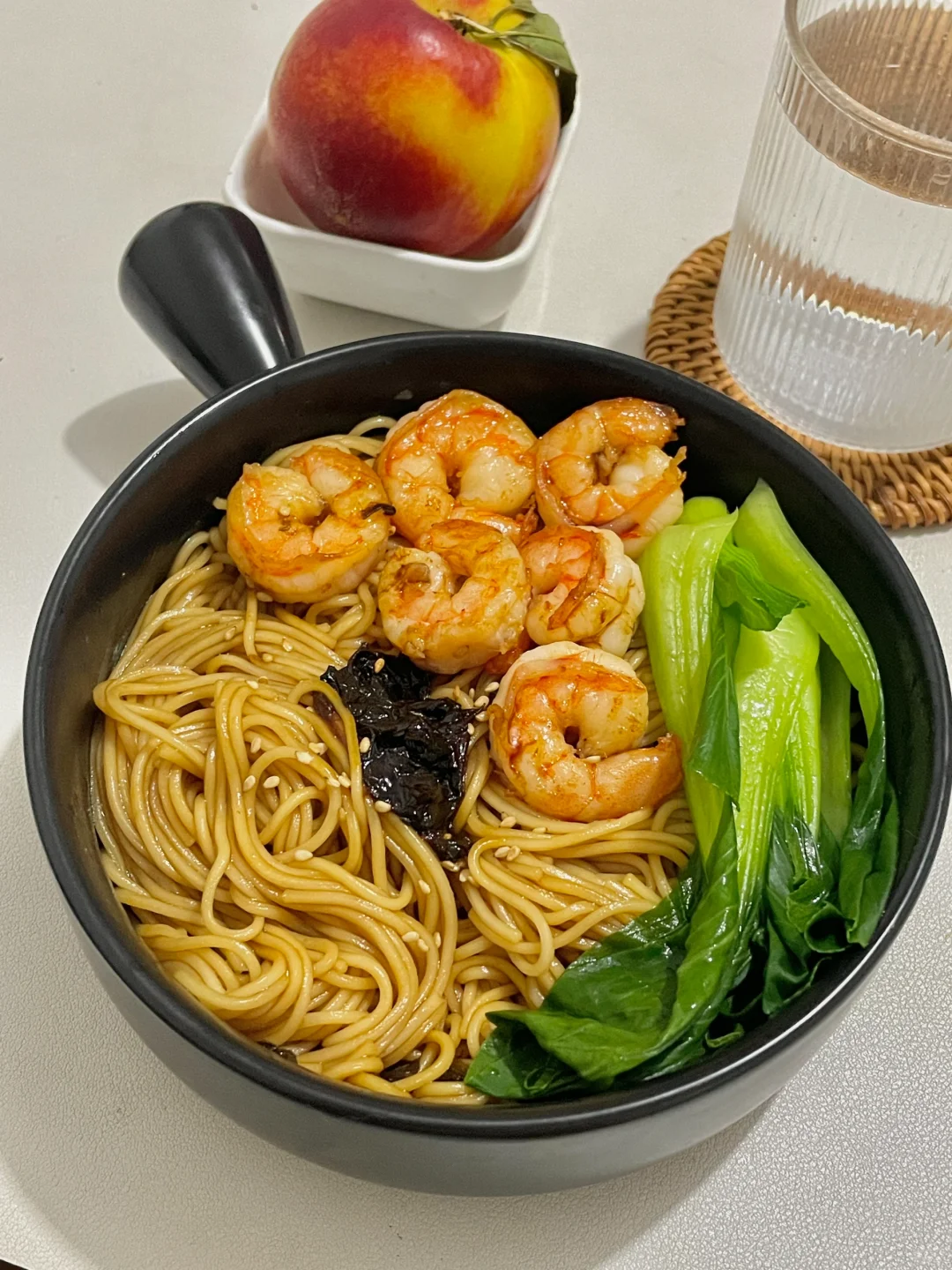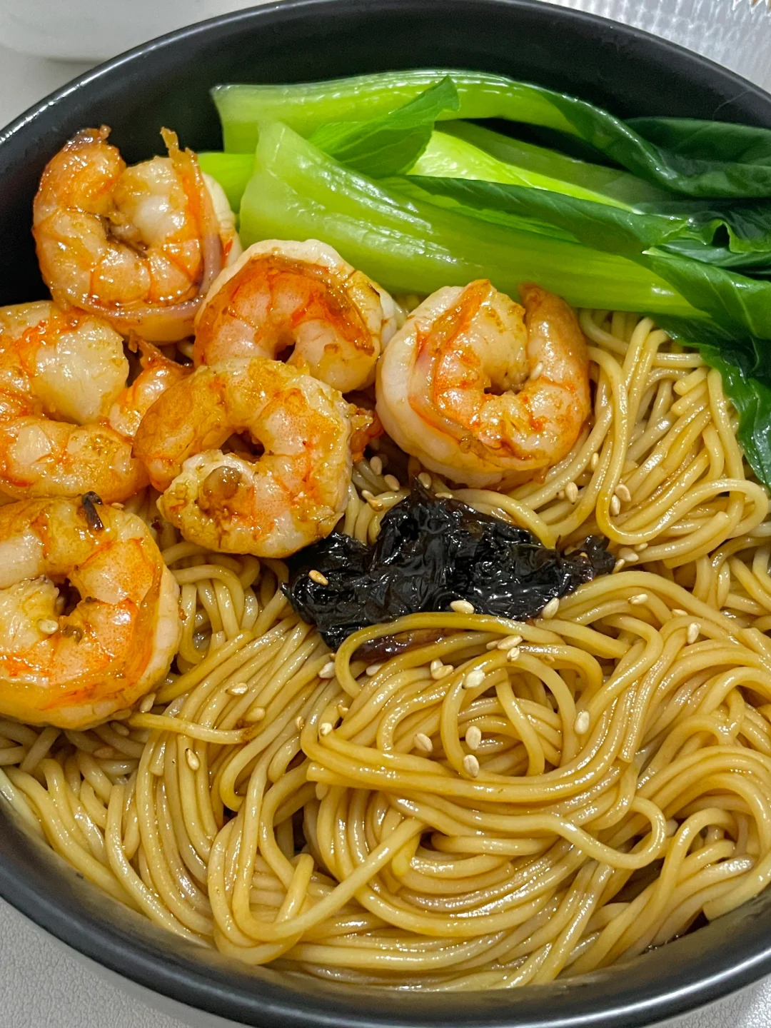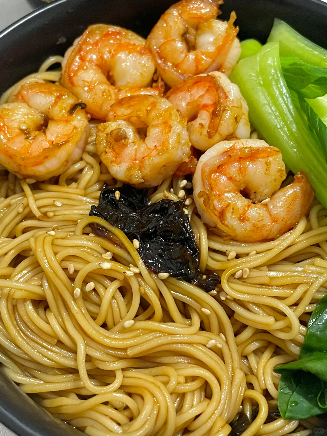 2️⃣面煮熟过凉水捞入碗中,加葱油。放虾仁青菜拌匀即可。