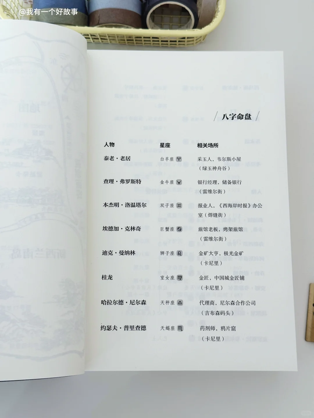 👍🏻这个设定真的好绝!好牛!看小说时不止一次感叹全文构思。抛开这些设定不谈,小说故事也非常吸引我,讲的是新西兰淘金时代的故事。