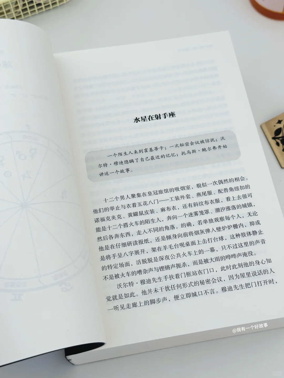 👉🏻这本悬疑小说中的主角就是分属黄道十二星座的十二个男子,有各自的性格和命运。厚厚一本书也只有十二章,章节模拟月亮变化,十二章节的篇幅依次减半,每章长度大约是前一章的二人之一左右,寓意月满盈亏。