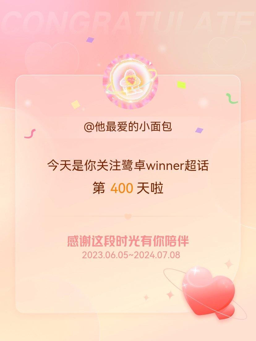 #鹭卓winner[超话]#今天是我关注超话的第400天,希望能继续伴你一路前行~
