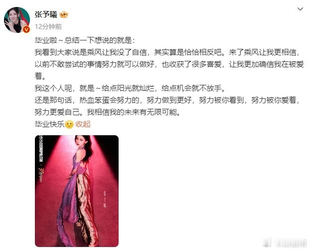 #张予曦乘风毕业##张予曦乘风2024收官文#让我们恭喜张予曦姐姐终于在乘风毕业啦,在她的收官文中,我们感受到乘风让她成长了很多,做了许多不敢做的事情,变成了更好的自己,我们也希望张予曦姐姐以后给我们带来更多不一样的惊喜啊!