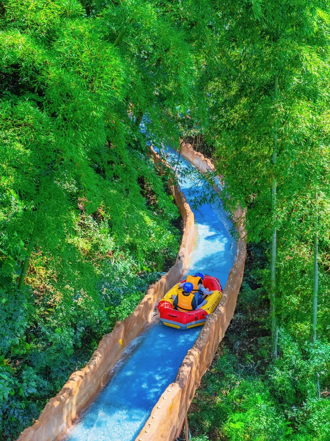全长2.3公里落差130m的漂流,在竹林里九曲十八弯,区别于传统漂流,可以一边漂、一边玩水!