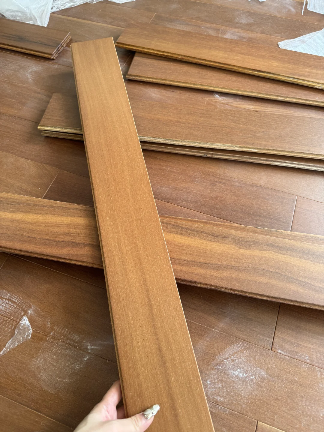 比想象的效果要好太多了吧 用的龙凤檀定制的颜色 既有柚木色的温馨 又有胡桃木色的沉稳 完美落地心目中的理想 颜色拿捏的特别好 进一步偏红老气 退一分少了复古味道 就是木地板真的很娇气 随随便就是一道划痕!!! 为了质感买单了