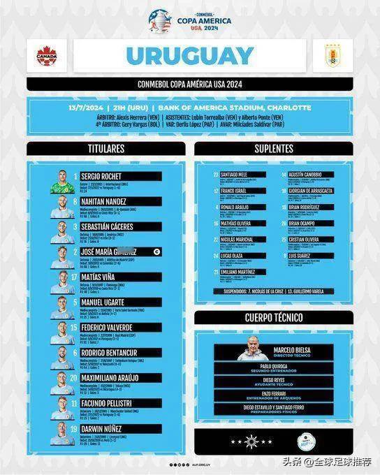 加拿大VS乌拉圭首发,努涅斯替补待命