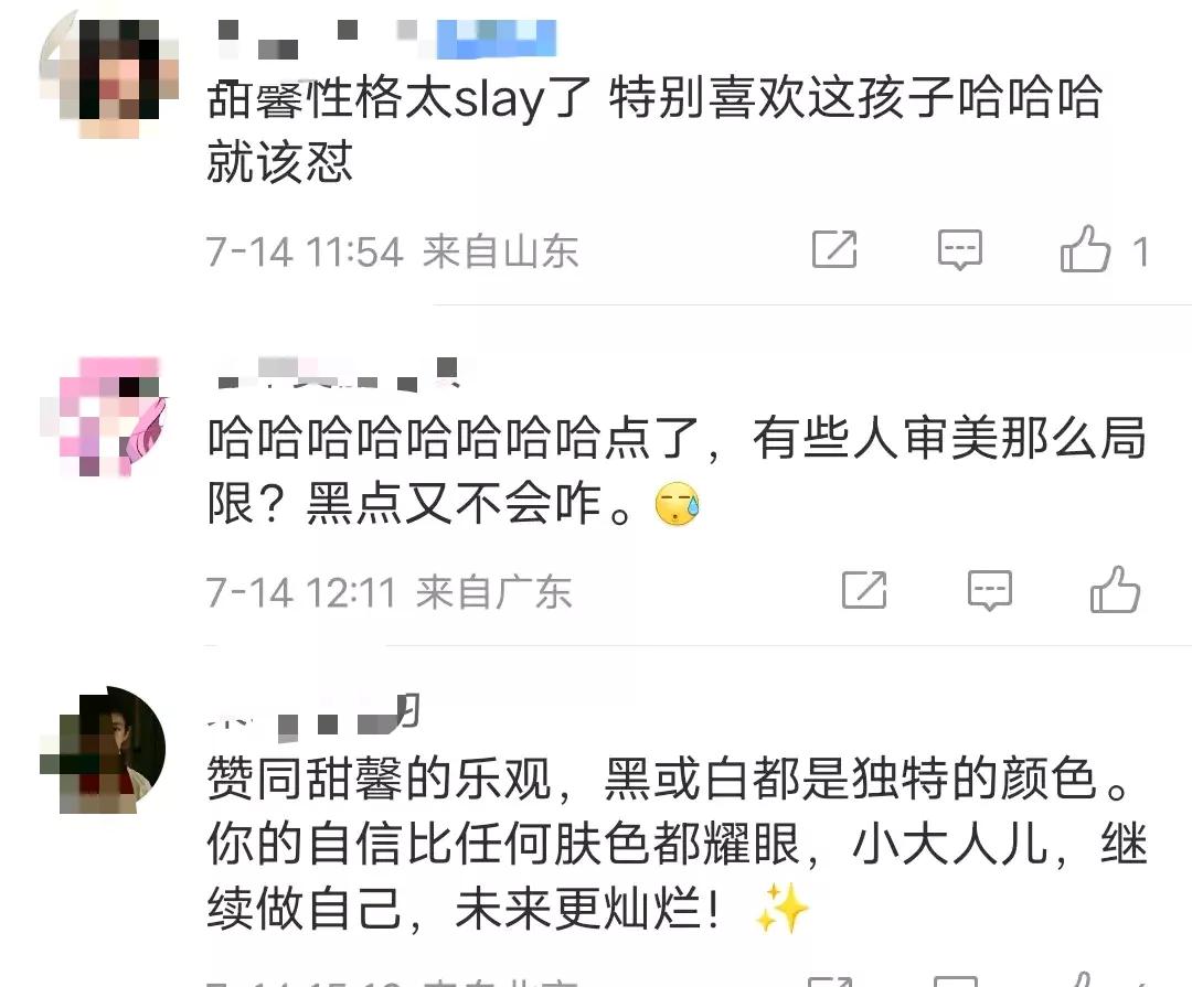 甜馨的嘴好厉害啊[赞]: “黑了就黑了呗,那咋了,要白的像死人吗?”究竟发生了什么呢? 这就是甜馨对于网友说她晒黑了的回应! 从甜馨的回应中可以看出,火药味十足。 网友也纷纷发表了自己的看法! 自从贾乃亮和李小璐离婚后,甜馨事实上已经成为单亲家庭的孩子,很小就承受了该年龄不该有的压力,也许她的这种回应跟父母的离婚有关吧!