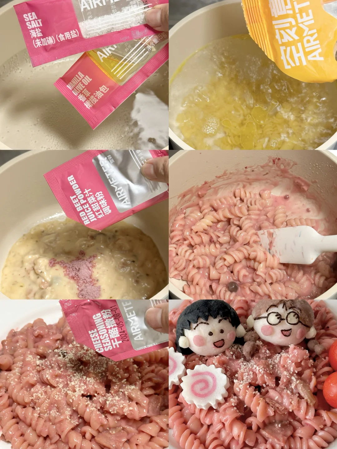 足不出户却又想吃到正宗美味的意面,今天就来试试空刻夏日限定的草莓熊奶油培根意面吧!搭配可爱的土豆泥小丸子,每一口,都吃下了满满的可爱!![萌萌哒R][萌萌哒R] 小丸子小玉所需材料: 山药,土豆,可可粉,仙人掌果粉,竹炭粉,巧克力酱 制作步骤: ①山药土豆切片蒸熟,加入黑椒海盐,一丢丢黄油,压成泥状 ②果蔬粉上色 ③捏出小丸子和小玉形象 ④巧克力酱装饰五官细节部分 意面制作步骤: ①起锅烧水,水中加入橄榄油和海盐,放入意面煮8分钟 ②意面沥水,加入料包小火翻炒一分钟 ③撒入适量干酪粉提香 快来试试这款奶油蘑菇培根配红甜菜汁的粉色意面吧~咸香浓郁的奶油意面,搭配绵密的小丸子黑椒土豆泥,别有一番风味呀~一份粉色系套餐get![飞吻R]