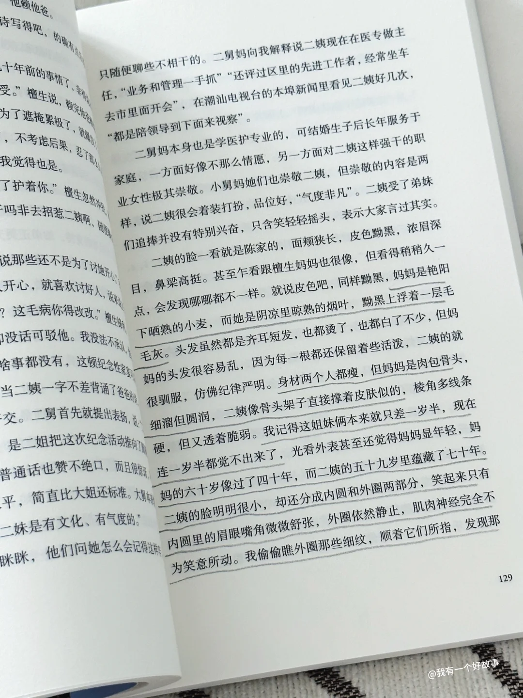 ✍🏻写妈妈和二姨的对比:妈妈是艳阳下晒熟的小麦,二姨是阴凉里晒熟的烟叶。妈妈的六十岁像是过了四十年,而二姨的五十九岁里蕴藏了七十年。二姨的脸明明很小,却还分成内圆和外圈两部分。我偷偷瞧着外圈那些细纹,顺着它们所指,发现那都是不快乐的方向。