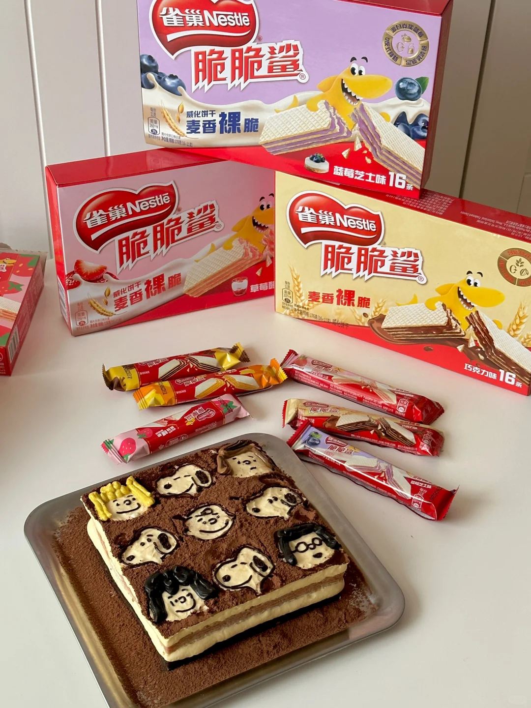 威化打底的花生家族小伙伴们提拉米苏蛋糕别有一番滋味~[萌萌哒R] 所需材料: 蛋黄4个,细砂糖 35g,浓缩咖啡液 30g,脆脆鲨裸威化24条,马斯卡彭 250g,淡奶油 250g,咖啡力娇酒20g 制作步骤: ①将蛋黄,砂糖,浓缩咖啡液混合,隔水打发至粘稠酸奶状,冷藏备用 ②淡奶油打发至酸奶状,加入马斯卡彭,翻拌均匀 ③蛋黄咖啡糊倒入打发好的奶油中,翻拌均匀 ④拿出雀巢脆脆鲨裸威化,在咖啡液(咖啡力娇酒20g➕少量浓缩咖啡液)中浸泡立刻拿出 ⑤挤入奶油糊,再重复一遍上述步骤 ⑥冷藏过夜,用锡纸剪出Snoopy形象贴在蛋糕表面,筛可可粉,揭掉锡纸,用巧克力酱和调好色的奶油装饰人物形象 近期种🌿的雀巢脆脆鲨裸威化,0️⃣反式脂肪,麦香浓郁,清新不腻,每咬一口都咔咔酥脆,好吃到停不下来~而且口味丰富,草莓酸奶,蓝莓芝士,巧克力味,芝士味,草莓味,都是真实原料制作,一定有一款是你喜欢的! 用脆脆鲨裸威化制作出的提拉米苏,口感更加清新,味道层次也丰富了起来,让爱吃甜品的你,负担小一些~健康多一些~ 都是独立小条包装,携带方便,平时出去玩也可以带上,随时随地都可以解解馋,没有涂层热量更低,轻松少负担哟~[飞吻R]