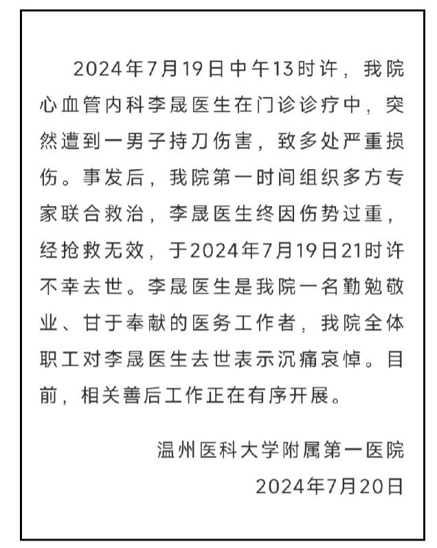 温州,被砍伤的李晟医生,没救过来,不幸去世,网传才51岁,看着更年轻,长相敦厚面善,温文尔雅,事发后,在抖音评论区,曾接受李先生诊治的患者家属们,一致赞扬李医生,医术、医德、人品都非常好,为他祈祷,感到非常痛心! 网传当时李医生在值班,中午1点,还没吃饭,突遭横祸,抢救了7、8个小时,身上多处严重损伤,凶手下手太狠了,网传因为家人手术后死了,为了泄愤,还没搞清楚医生,错把李先生当成了对方,李先生真是无妄之灾!一路走好! 医患矛盾,再次以悲剧方式,敲响警钟!