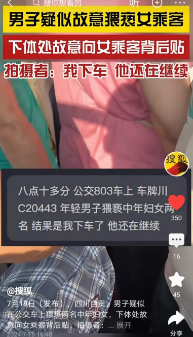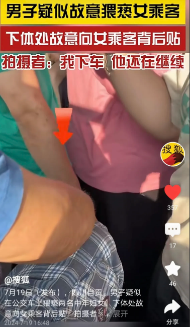 这件事发生在四川自贡803路公交车上,这个视频是一女子拍下的,因为她看到这位男子故意把自己的下体去顶两位阿姨的身体,其实男子在做这些事的时候,他也看到了这位女网友在注意他,他一边做着下流的事,一边还把眼睛看向她,好像在向她挑衅。