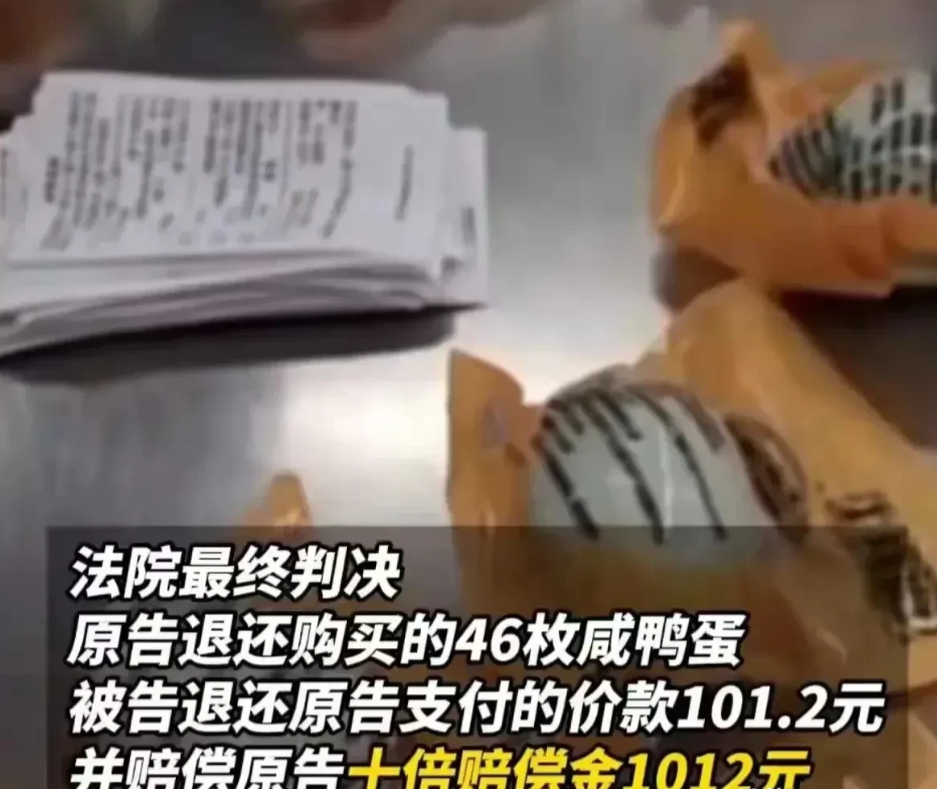 他愿意接受10倍赔偿,46枚咸鸭蛋101.2元,按照10倍赔偿,赔偿您1012元。