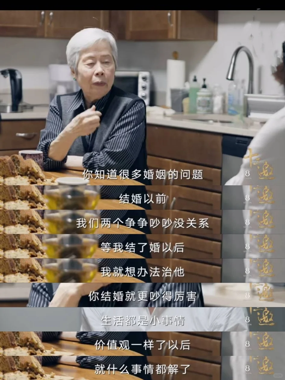 孙曼丽说:婚姻不是把人绑死,不是说我和你结婚了,就没有空间了,不需要天天黏在一起。真正好的婚姻是把人给激活。她说在婚姻当中的问题,价值观一样了以后,就什么问题就都能解决了。