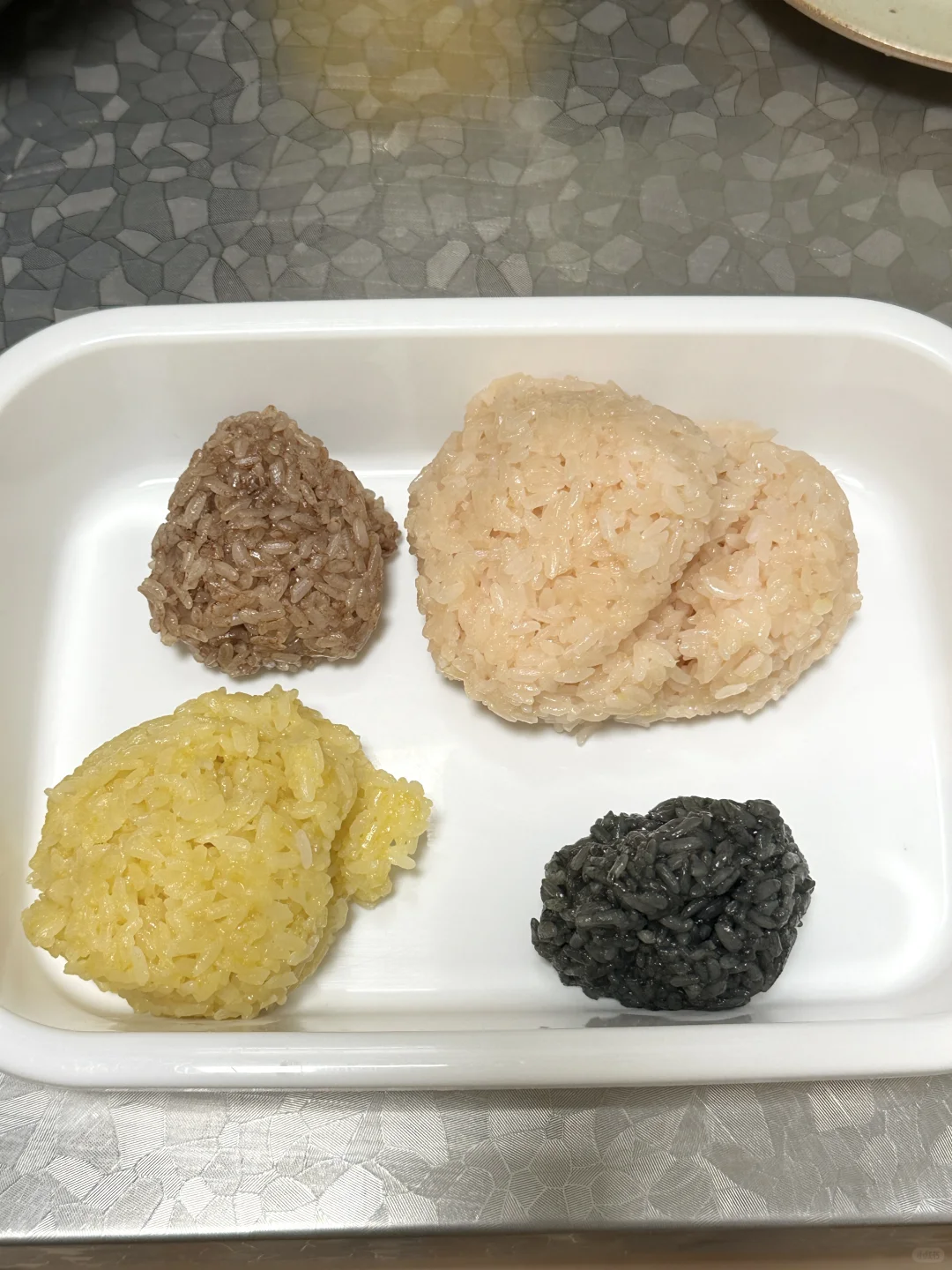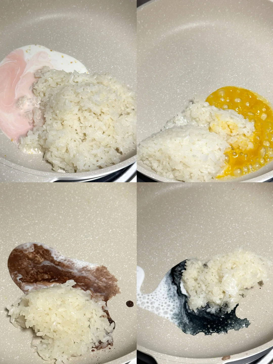 ④蒸好的糯米分好,依次放入不粘锅,半汤勺椰浆➕一小勺果蔬调色水,中小火翻炒直至收汁儿