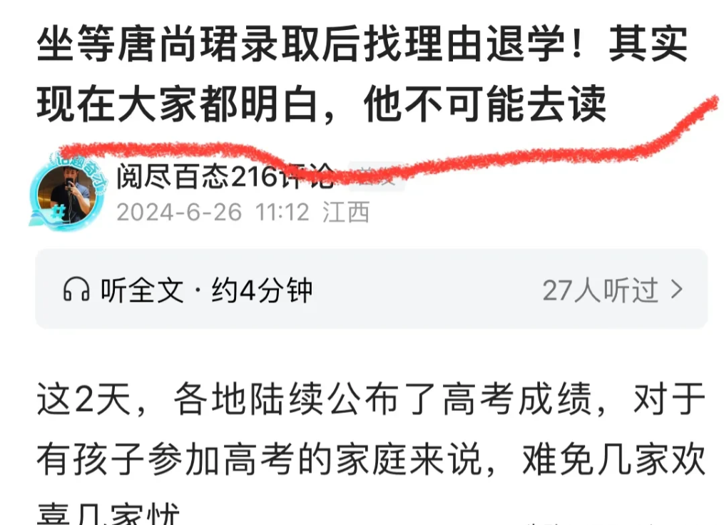 当时我就说,唐尚珺不会真的去读大学!当时还有很多人不信,看吧,现在已经在找理由了,他说专业不满意,在考虑复读,真是狠狠打脸,因为之前他说了不会去复读了。