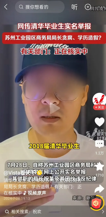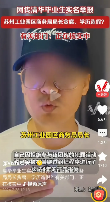事大了!清华毕业生举报局长贪腐!7月28日,苏州工业园区一名清华大学毕业生马某某,在网上实名举报局长贪腐,学历造假等等,而且表示已经向当地举报受理了一年多但是没有回音,这事一下子就引发了网友热议。
