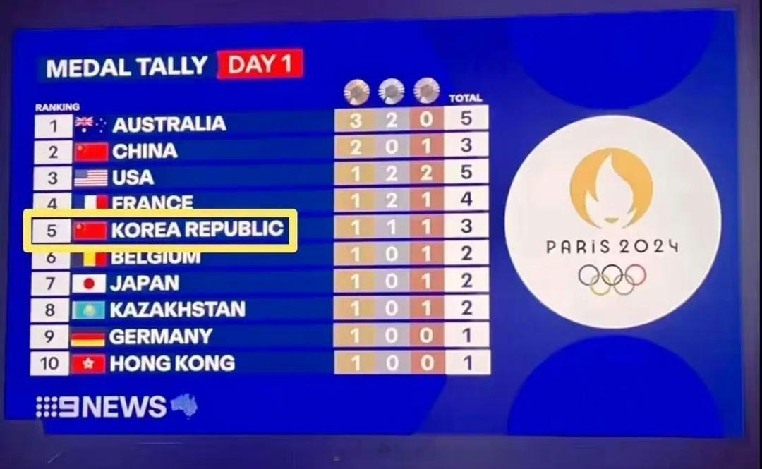 法国巴黎奥运开幕式把韩国喊成朝鲜,现在韩国国旗又搞错成了南非。
