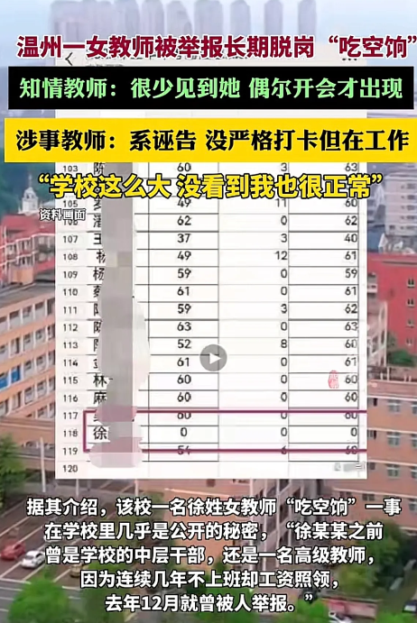 “严查吃空饷!”浙江温州,女子在一所中学教书。她发现有个女老师,最近3、4年基本不来学校给学生上课,月打卡记录经常为0,但依旧能领到高级教师的工资,一直在“吃空饷”。更可恨的是,女子的丈夫举报后,学校和教育部门都不处理。当事女老师则说:学校这么大,没看到我也很正常!遭到网友炮轰。