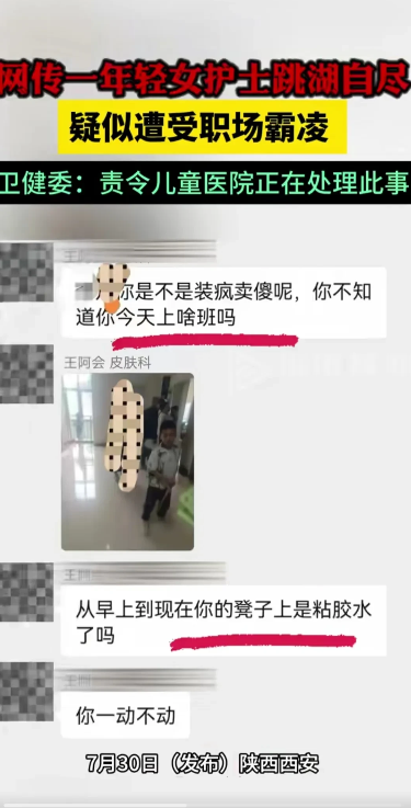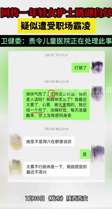 女护士疑遭霸凌跳湖自尽? 近日,一则为女儿喊冤的帖子被冲上热搜。 从聊天记录中就能看出,这名女护士对于工作上的霸凌明显已经有些力不从心。