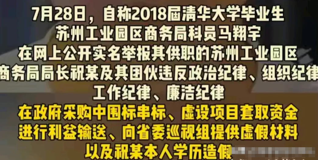 最近,苏州工业园区商务局原局长祝某涉嫌严重违纪违法受到网友举报。这起举报事件的主人公马翔宇,是一位18级清华毕业生,他毅然站出来实名举报自己领导各种违法行为,以及自己由于不同流合污而受到的打压。
