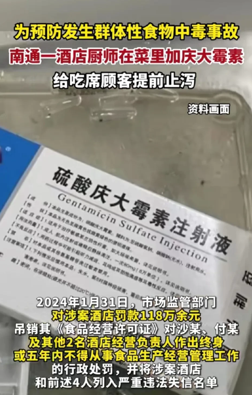 “身败名裂!”江苏南通,男子去酒店当学徒,但大厨和助手却从来不让他进厨房,还说怕男子学会了就会离开,男子觉得这个理由很可笑,没想到,男子却发现他们往菜里放庆大霉素,大厨却说:这是给顾客防止拉肚子的。男子气得他们举报了。