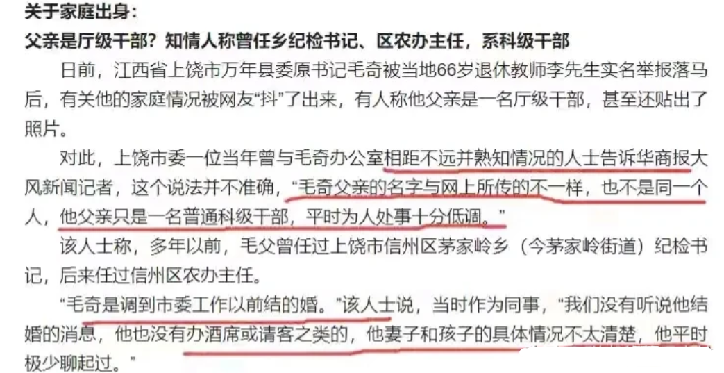 该人士称,多年以前,毛父曾任过上饶市信州区茅家岭乡(今茅家岭街道)纪检书记,后来任过信州区农办主任。
