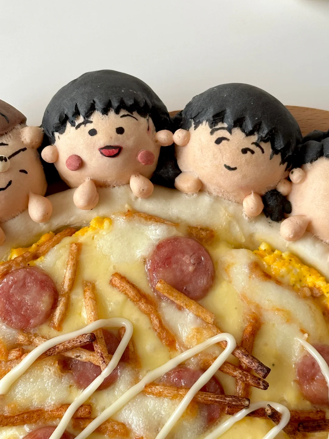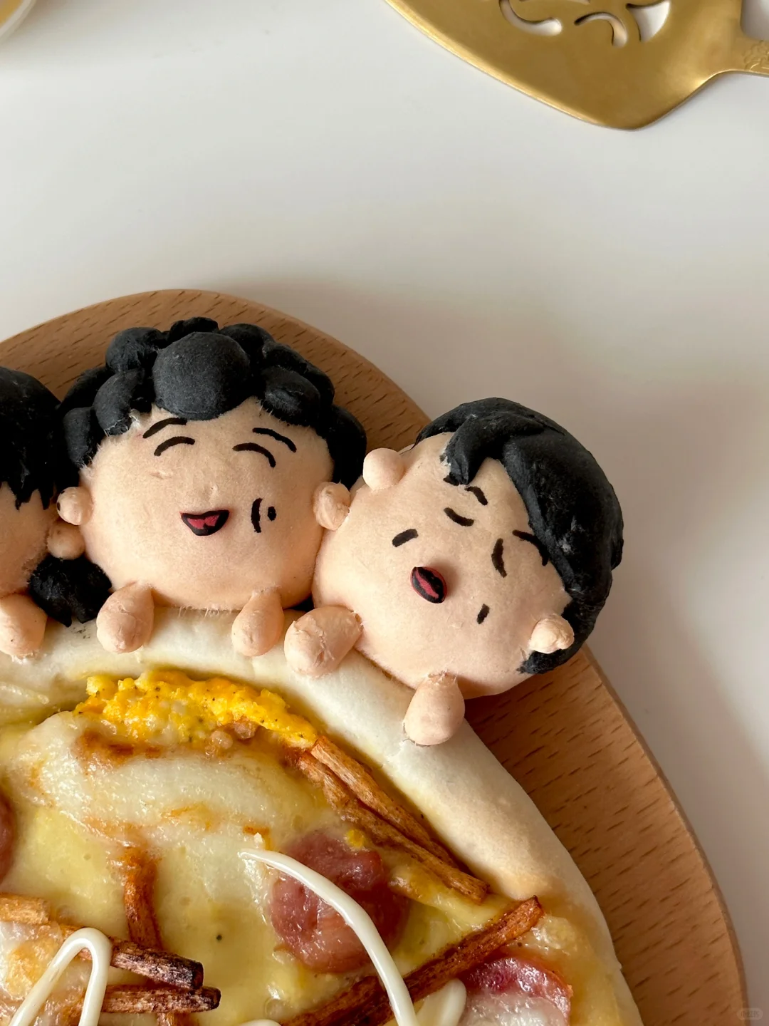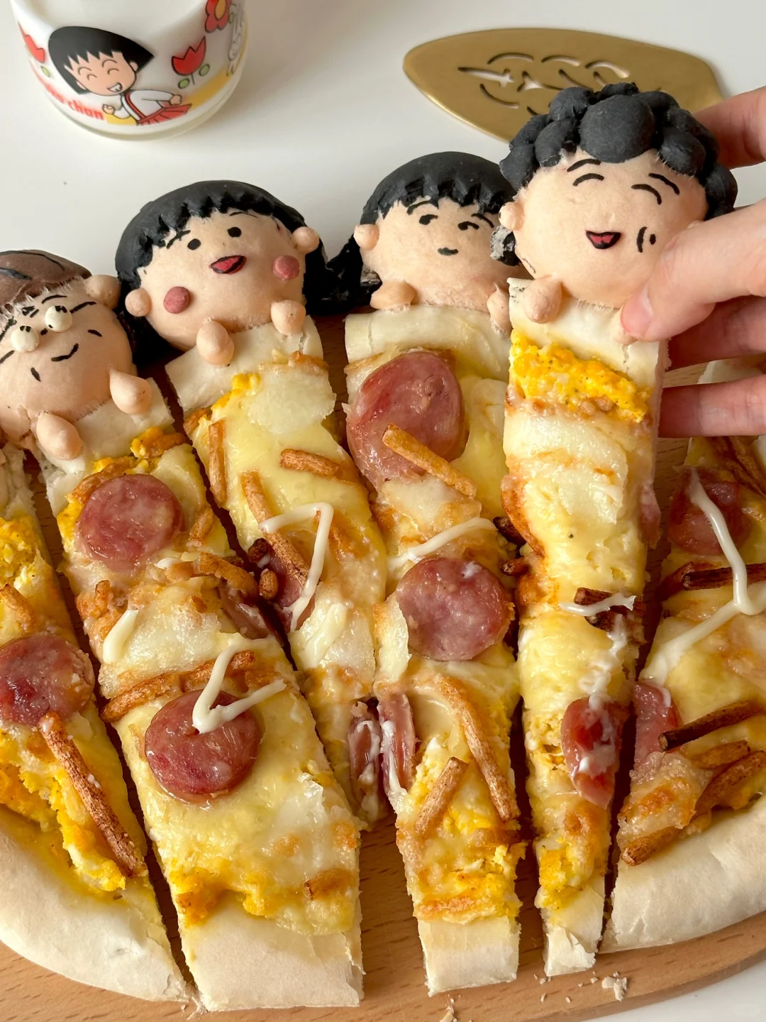 这次是可爱的小丸子一家人,每个脑袋里都包裹着满满的芝士~搭配鸡蛋沙拉火腿和脆辣棒~真的很好吃了